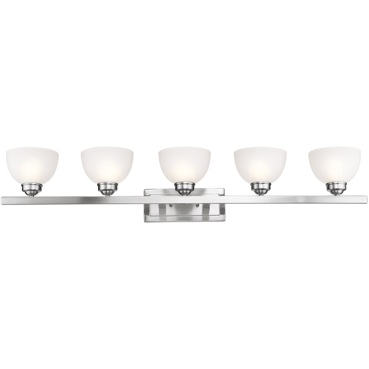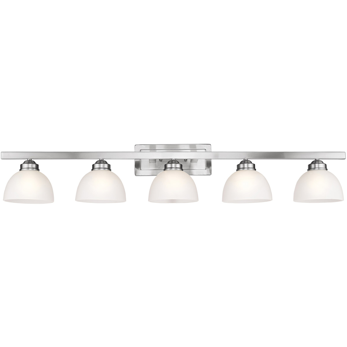 Smooth lines meet gorgeous materials in our Somerset collection. The sleek design will add contemporary class and appeal to your home. This five light bath fixture features a brushed nickel finish with satin glass.