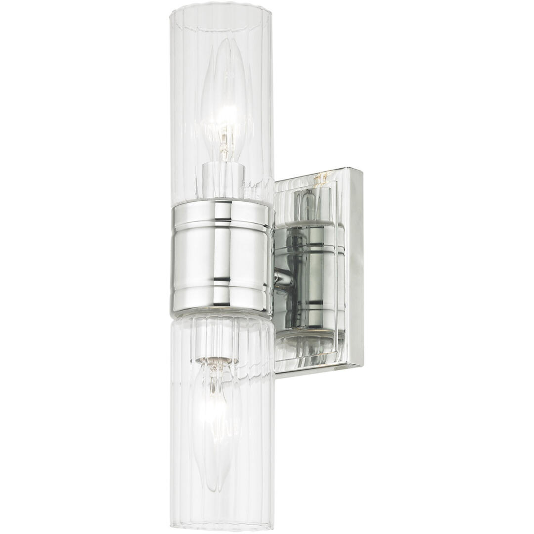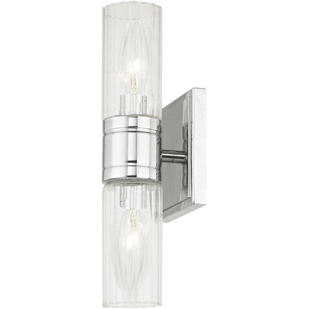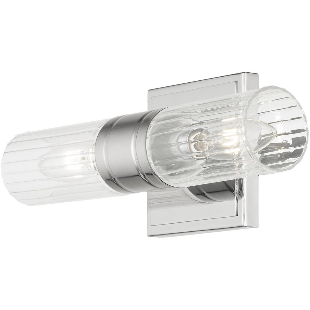 The Midtown two light bath fixture in polished chrome finish with clear ribbed glass shade offers a mix of the classic and the modern. Perfect for a contemporary home or a traditional entryway, this transitional fixture is as versatile as it is appealing.