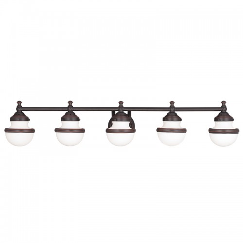 Sleek and simple lines define this beautiful olde bronze bath fixture. The clean, bold look of modernity blends with a raw industrial inspiration and hand blown white opal glass give this design a versatile and eclectic look that works with nearly any style of home decor.