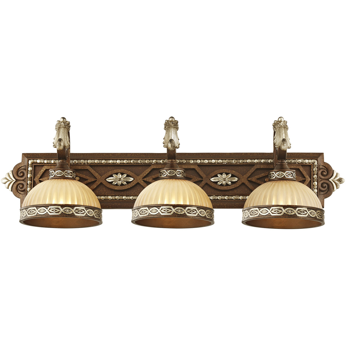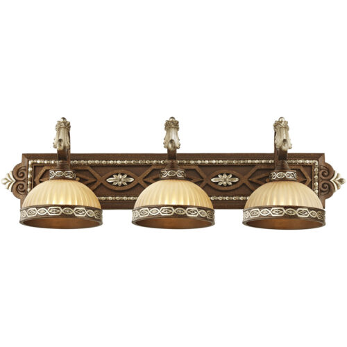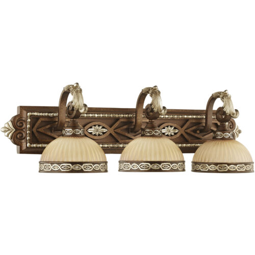 Neoclassical influence is merged with high fashion glamour in this luxurious bathroom fixture. The exquisite Gilded Accents give this light lasting elegance with the combination of palacial bronze finish and detailed patterns is delightful. Three hand crafted gold dusted art glass shades complement the extensive detail of the fixture.