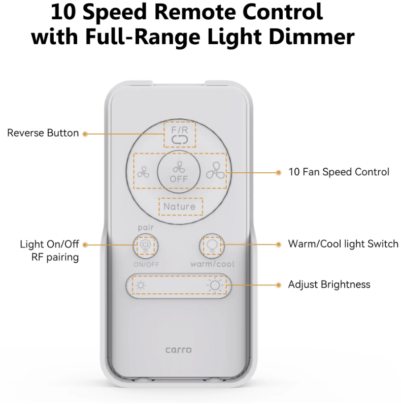 - Full function remote control – fan speed, light on/off/dim, reverse function