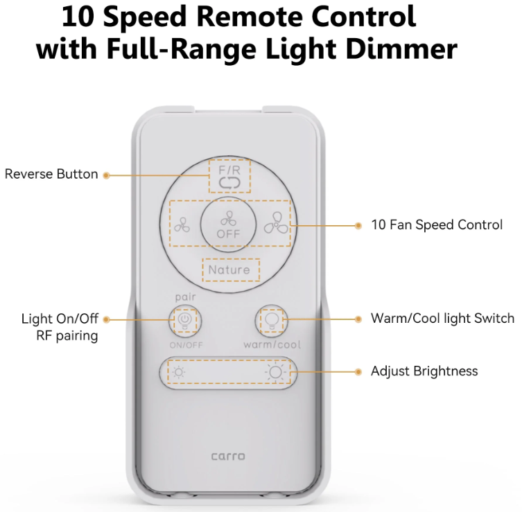 - Full function remote control – fan speed, light on/off/dim, reverse function
