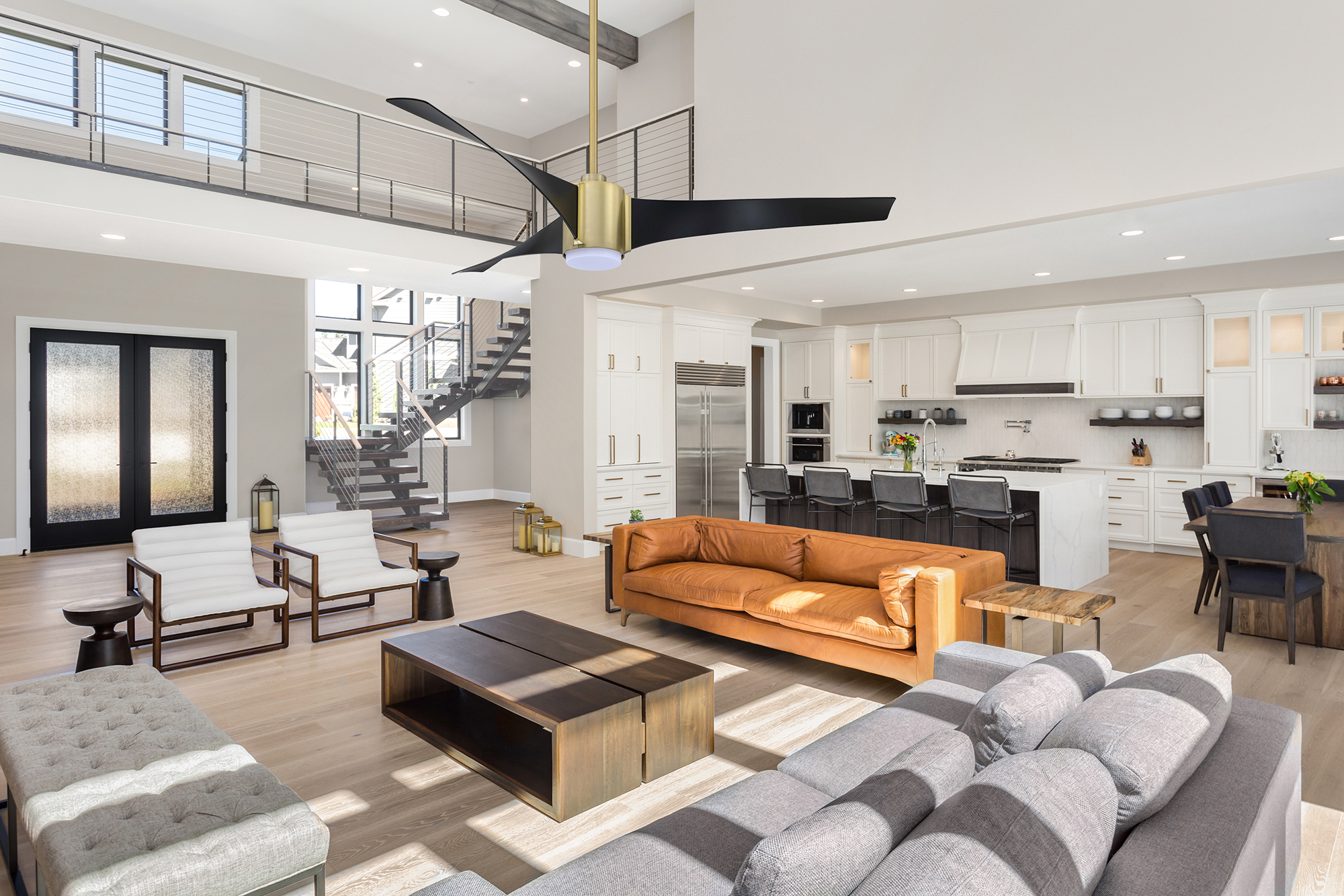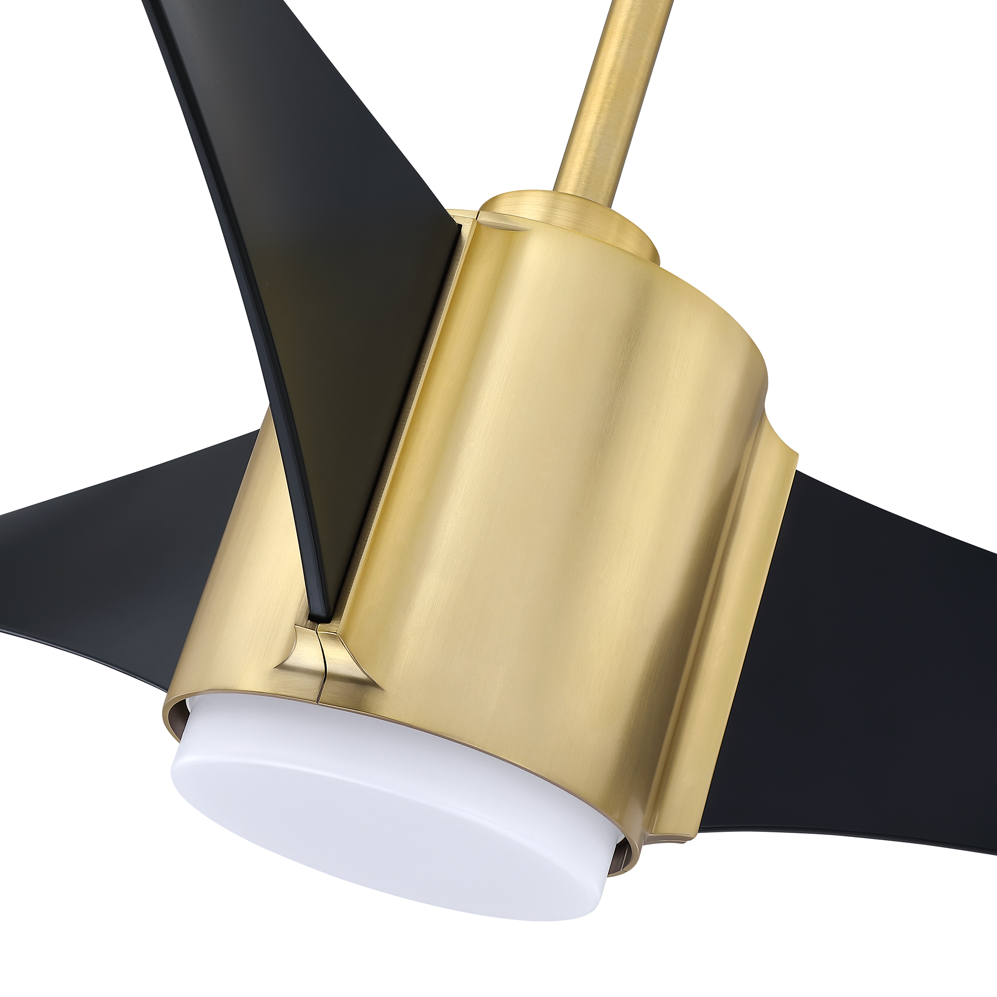 CIMION 60 in. 3 Blade DC Motor Ceiling Fan with Adjustable Color LED Light Kit and Remote Control in a Black & Brass finish with Black blades. The included Full-function Remote Control provides 6 Speeds, CCT (LED Color) Adjustability, LED Dimmer, 2/4/8 Hour Timer to shut Fan off Automatically, and a Variable Wind feature which modulates Fan Speed to simulate a Natural Breeze.