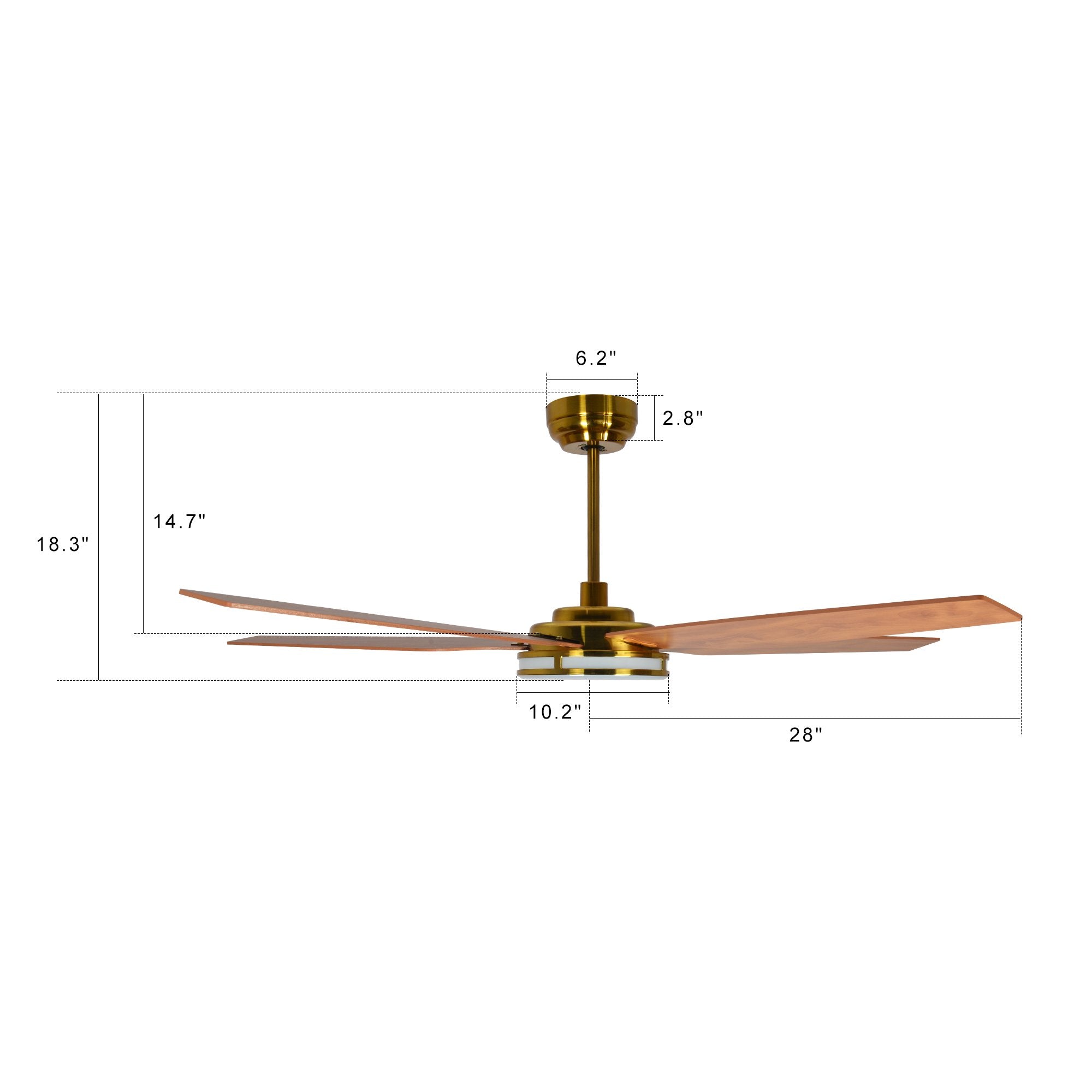 This Elira 56” smart ceiling fan keeps your space cool, bright, and stylish. It is a soft modern masterpiece perfect for your large indoor living spaces. This Wi-Fi smart ceiling fan is a simplicity designing with Gold finish, use elegant Plywood blades and has an integrated 4000K LED cool light. The fan features Remote control, Wi-Fi apps, Siri Shortcuts and Voice control technology (compatible with Amazon Alexa and Google Home Assistant ) to set fan preferences.
