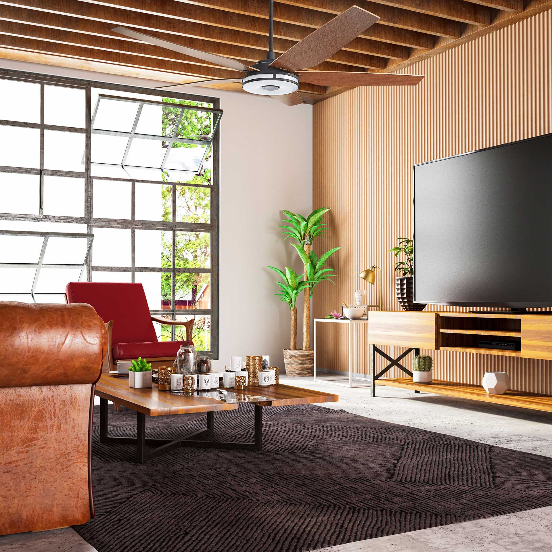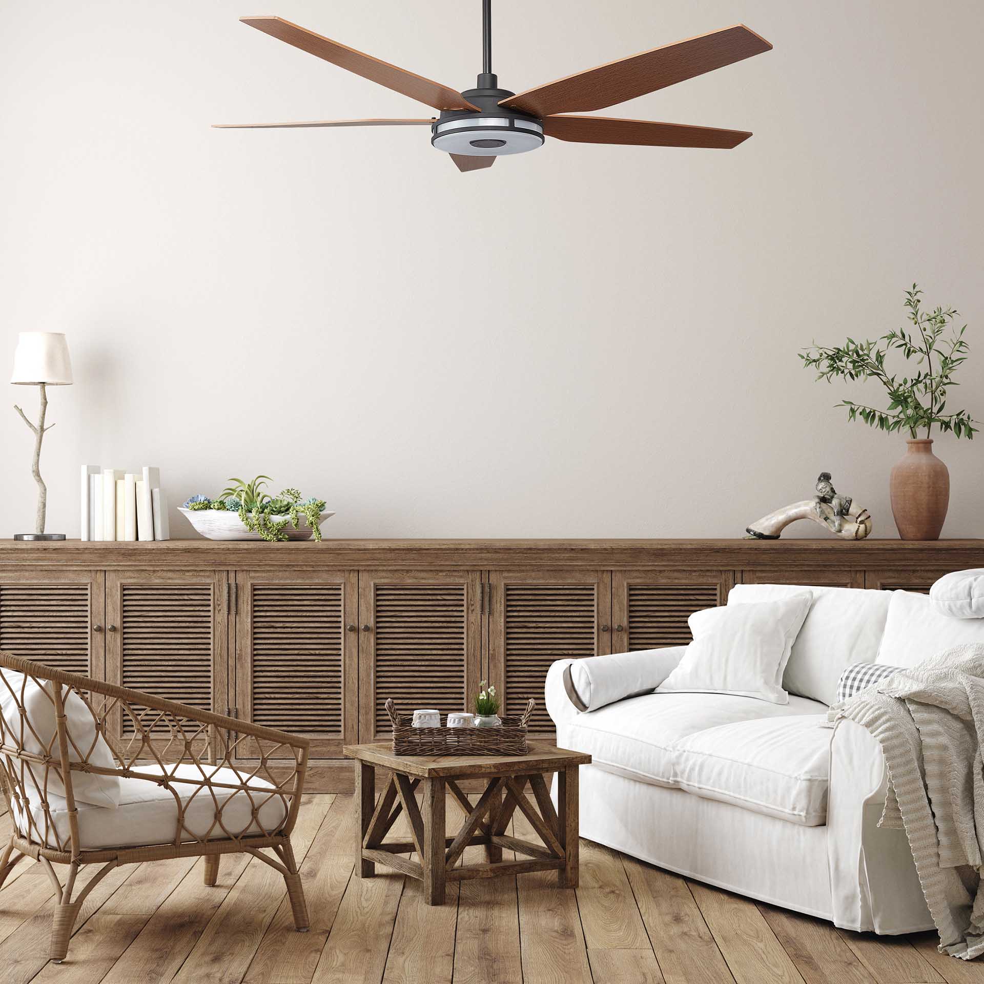 This Elira 56” smart ceiling fan keeps your space cool, bright, and stylish. It is a soft modern masterpiece perfect for your large indoor living spaces. This Wi-Fi smart ceiling fan is a simplicity designing with Black finish, use elegant Plywood blades and has an integrated 4000K LED cool light. The fan features Remote control, Wi-Fi apps, Siri Shortcuts and Voice control technology (compatible with Amazon Alexa and Google Home Assistant ) to set fan preferences.