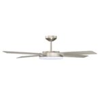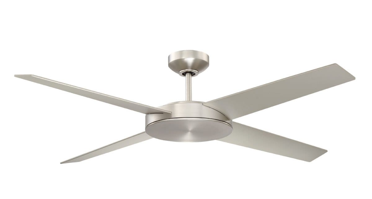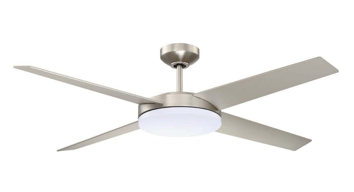 LOPRO 4-blade Ceiling Fan featuring a low-profile motor housing in a Satin Nickel finish with matching blades spanning 52 inches. The silent running DC motor maximizing energy efficiency. An integrated LED Light Kit and Remote Control are also included.