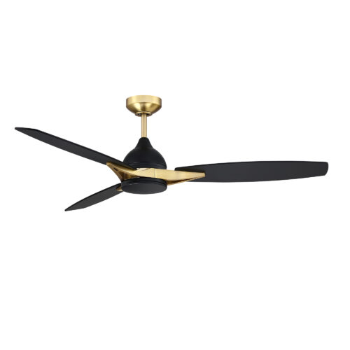 NOVUM 56 in. 3 Blade DC Motor Ceiling Fan with Adjustable Color LED Light Kit and Remote Control in a Black & Brass finish with Black blades. The included Full-function Remote Control provides 6 Speeds, CCT (LED Color) Adjustability, LED Dimmer, 2/4/8 Hour Timer to shut Fan off Automatically, and a Variable Wind feature which modulates Fan Speed to simulate a Natural Breeze.