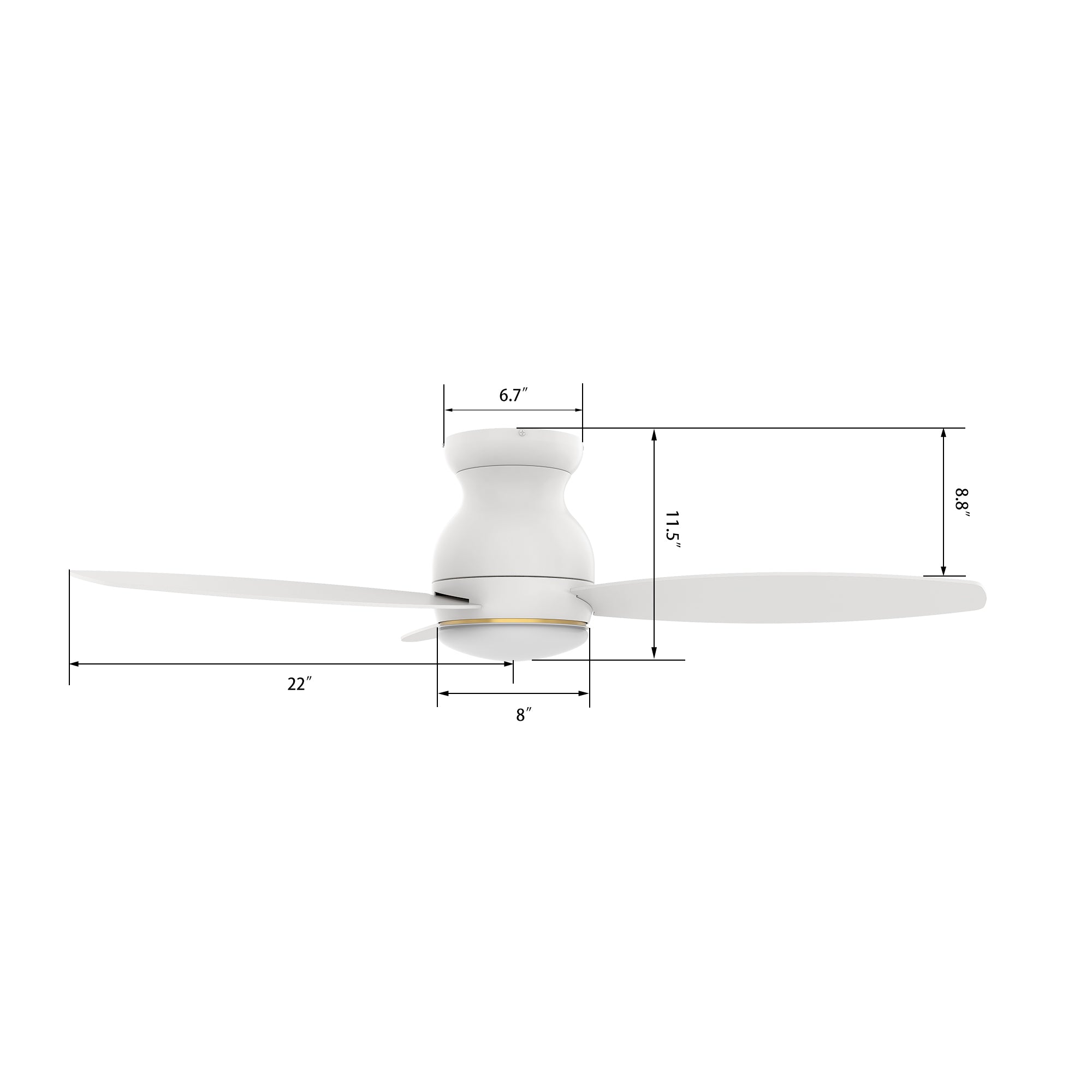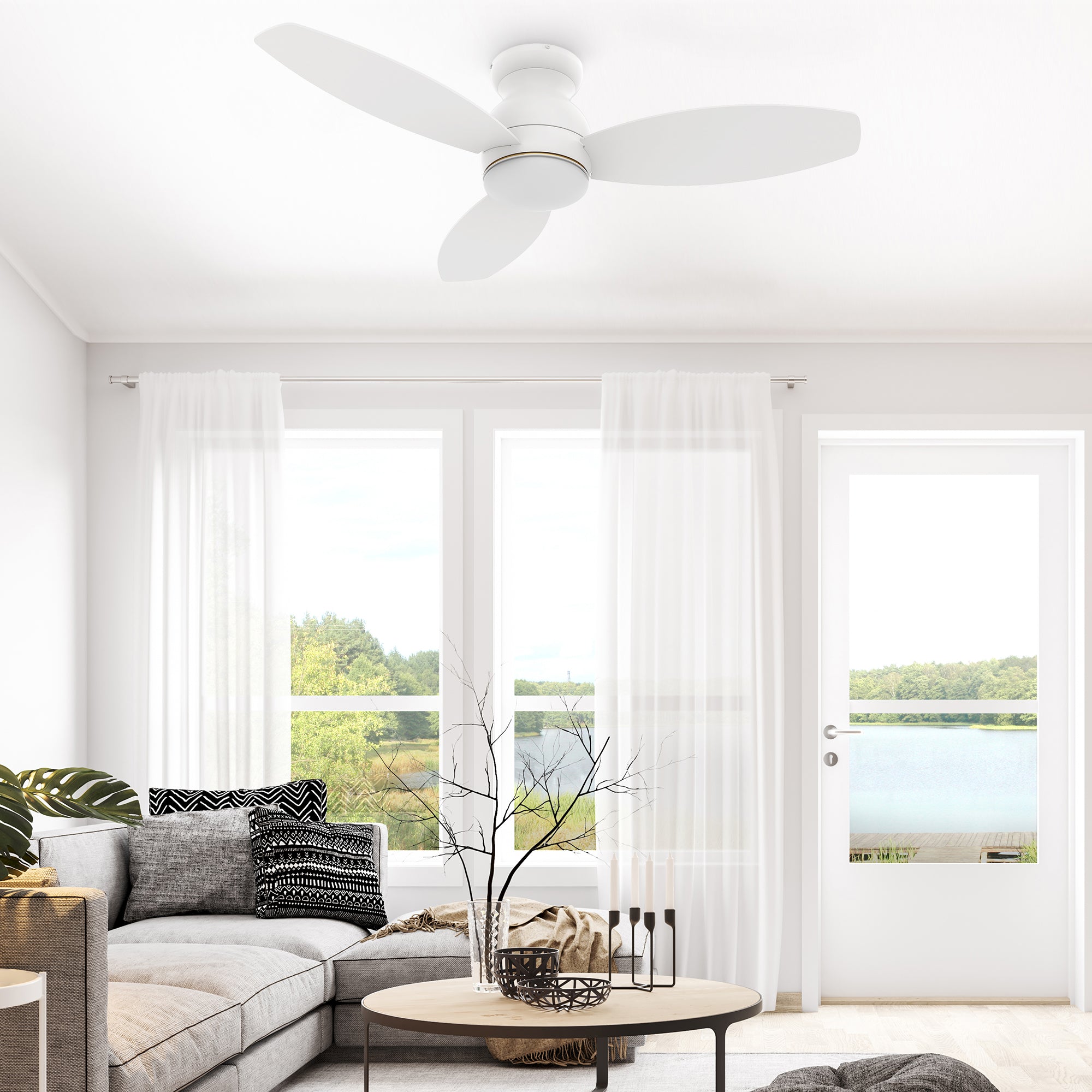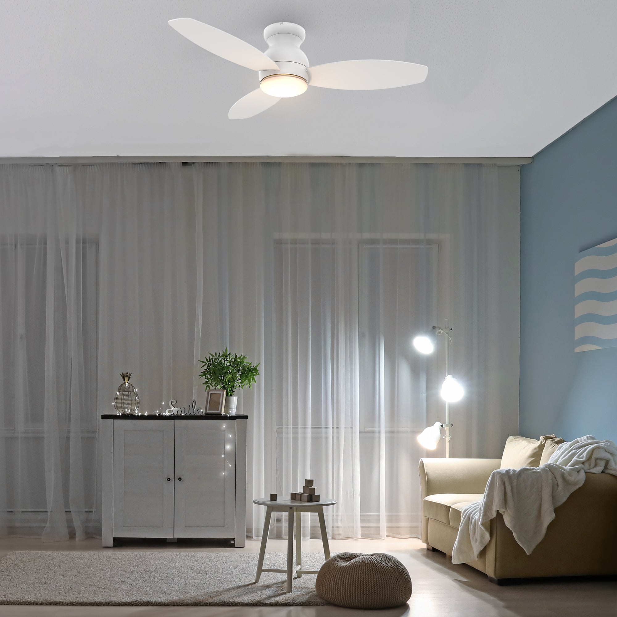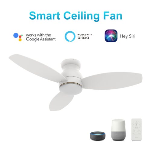The Trento Smart Ceiling Fan with 3 blades and a 44-inch blade sweep with a flush mounted motor case and tropical inspired blades. The wide paddle shaped fan blades are elegant White Plywood blades. The motor case is a White finish and one of our few flush mounted DC motor fans. A dimmable 4000K LED lighting kit that can change between bright white, soft warm light, and a combination of both for a neutral temperature. The fan features Remote control, Wi-Fi apps, Siri Shortcuts, and Voice control technology (compatible with Amazon Alexa and Google Home Assistant ) to set fan preferences.