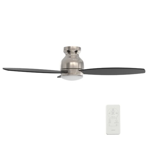 The Trento Smart Ceiling Fan with 3 blades and a 48-inch blade sweep with a flush mounted motor case and tropical inspired blades. The wide paddle shaped fan blades are elegant Black Plywood blades. The motor case is a Silver finish and one of our few flush mounted DC motor fans. A dimmable 4000K LED lighting kit that can change between bright white, soft warm light, and a combination of both for a neutral temperature. The fan features Remote control, Wi-Fi apps, Siri Shortcuts, and Voice control technology (compatible with Amazon Alexa and Google Home Assistant ) to set fan preferences.