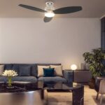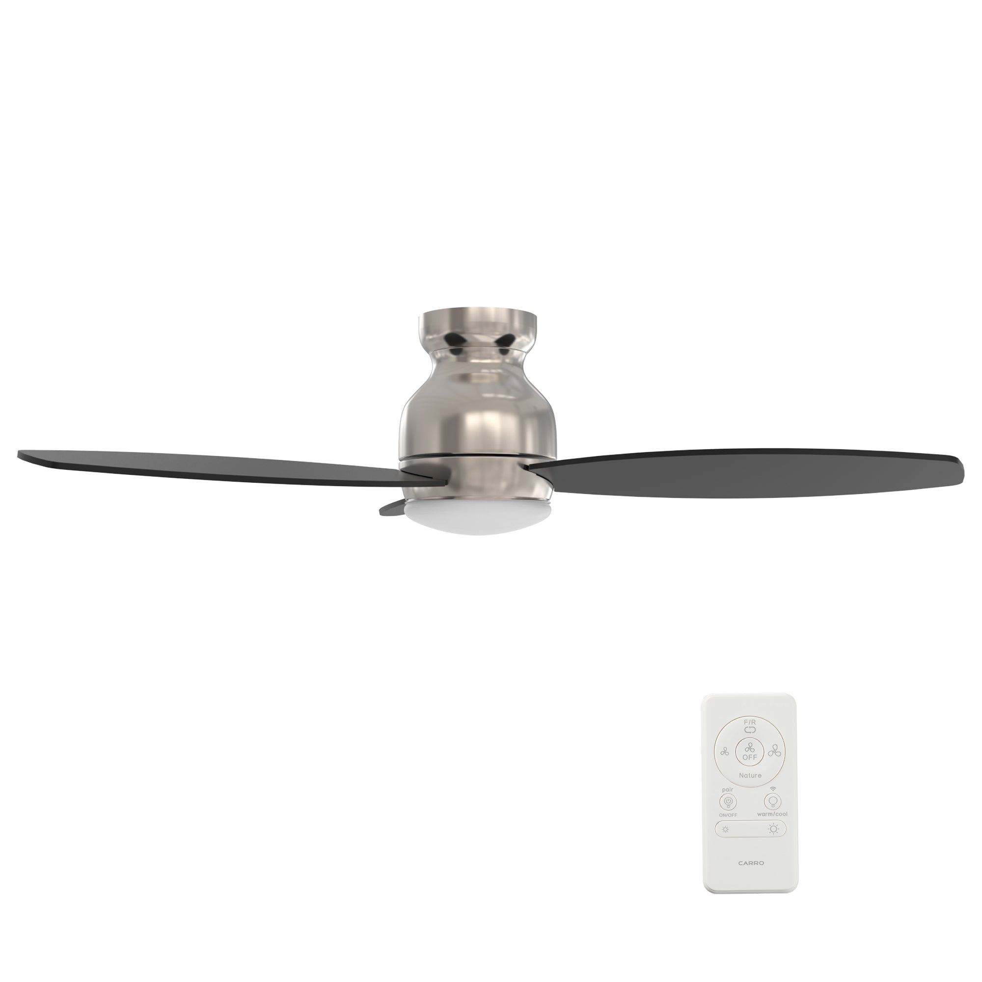 The Trento Smart Ceiling Fan with 3 blades and a 52-inch blade sweep with a flush mounted motor case and tropical inspired blades. The wide paddle shaped fan blades are elegant Black Plywood blades. The motor case is a Silver finish and one of our few flush mounted DC motor fans. A dimmable 4000K LED lighting kit that can change between bright white, soft warm light, and a combination of both for a neutral temperature. The fan features Remote control, Wi-Fi apps, Siri Shortcuts, and Voice control technology (compatible with Amazon Alexa and Google Home Assistant ) to set fan preferences.