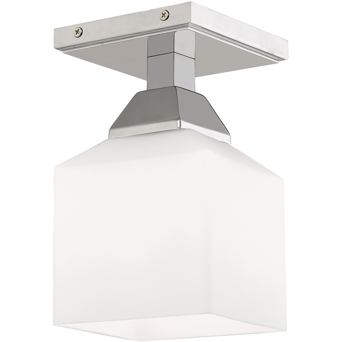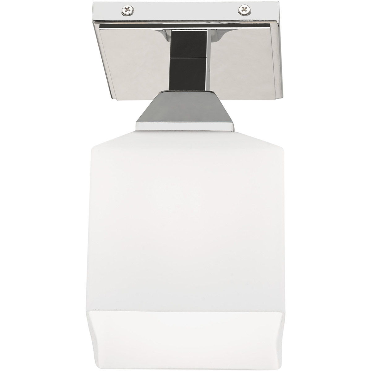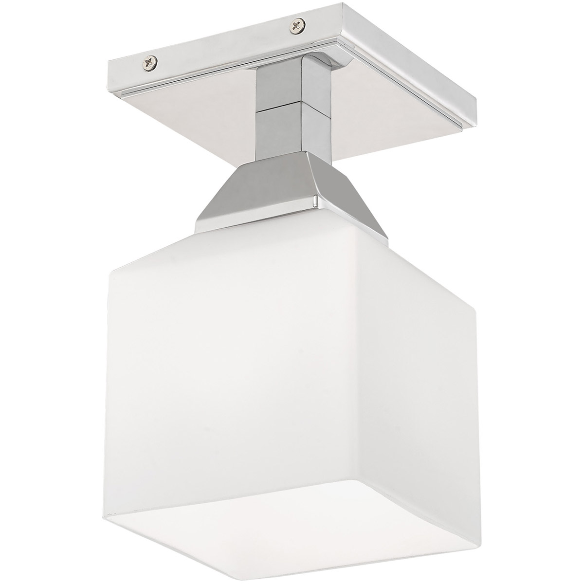 This ceiling mount light is sure to provide reliable illumination without sacrificing style. It features one satin opal white glass shade with an open bottom, exposing the bulb inside. A polished chrome finish covers the canopy and accents the light.
