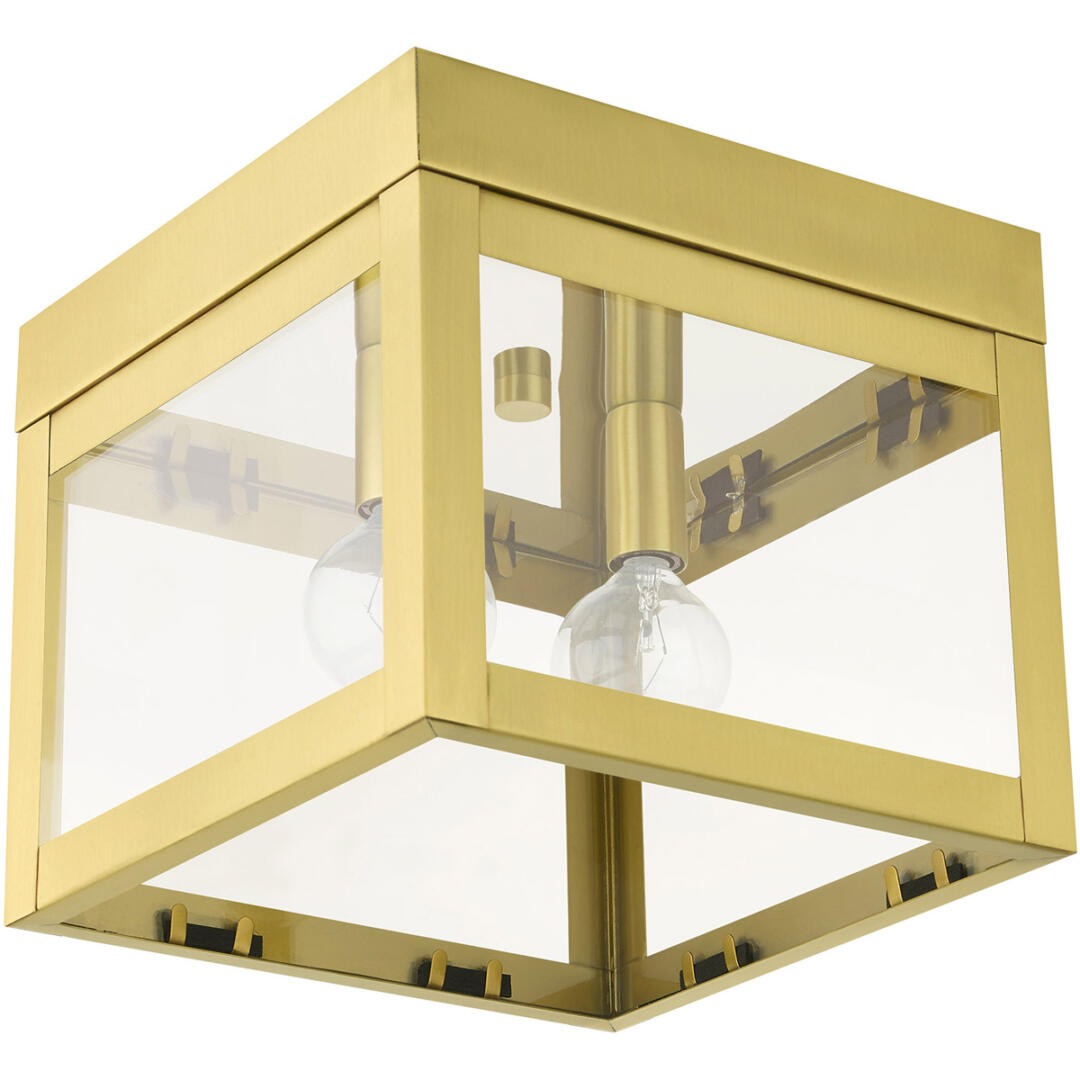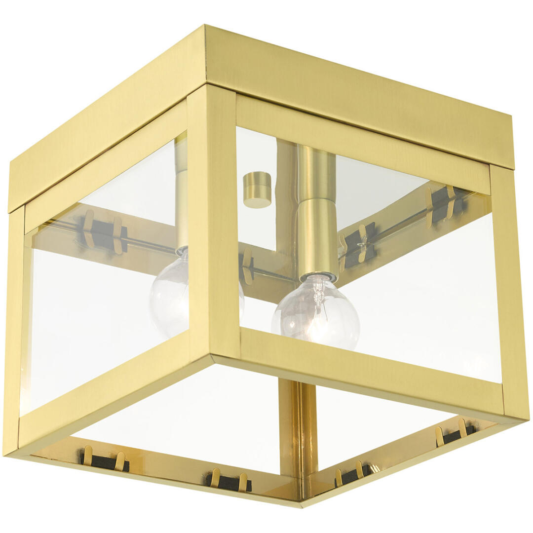 A dramatically simple shape and bold lines help define our Nyack solid brass ceiling mount two-light fixture. This piece features a satin brass finish with clear glass panels exposing the candles set off by a polished chrome stainless steel reflector giving an illusion of a double light effect. With superb craftsmanship and affordable price, this fixture complements transitional, nautical, contemporary or colonial homes.