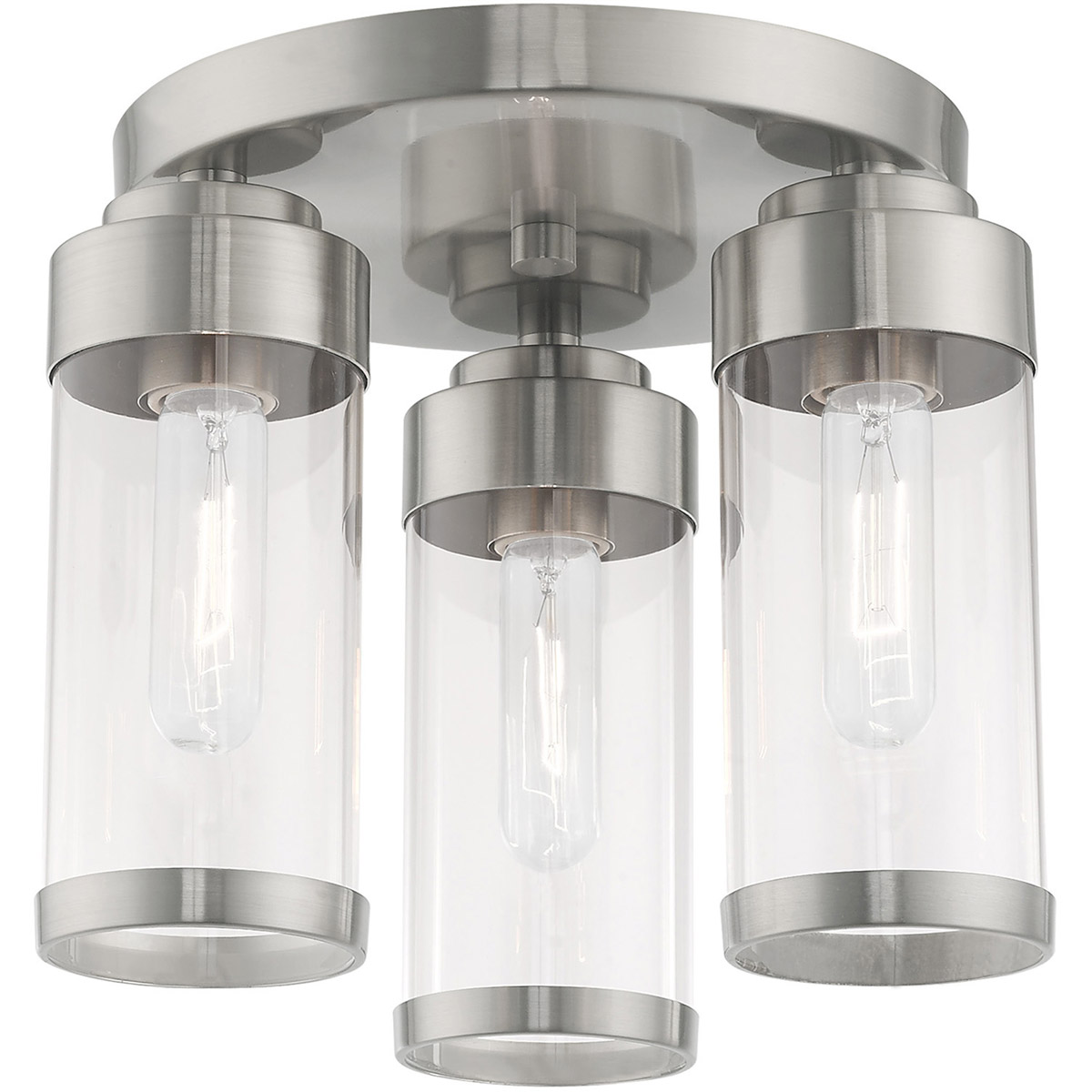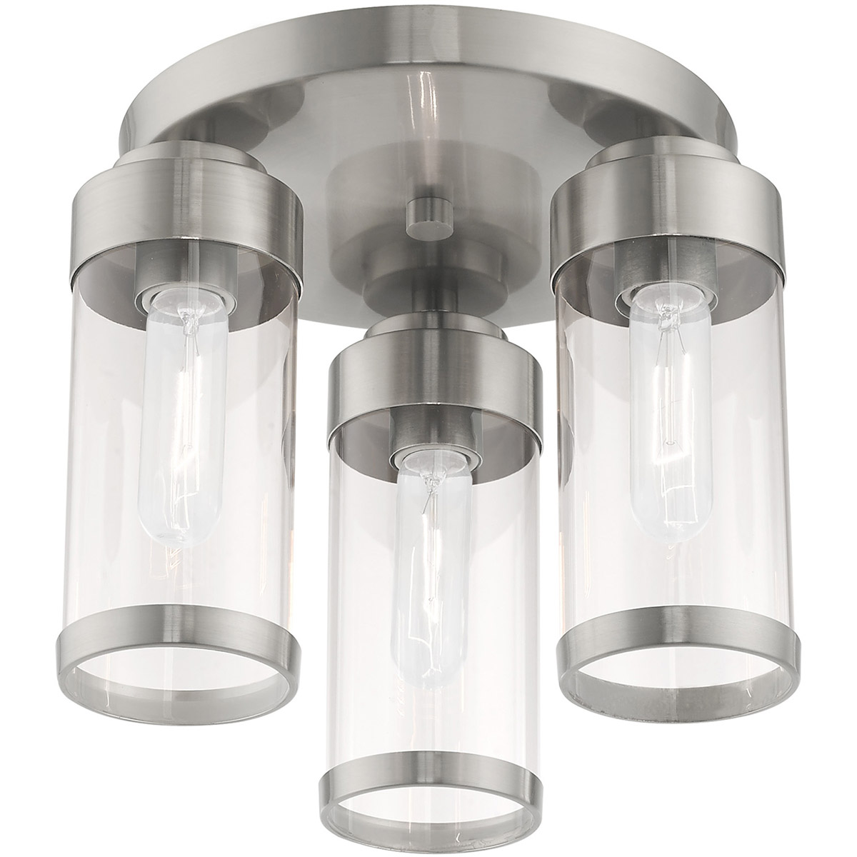 The three light ceiling mount from the Hillcrest collection features a simple elegant brushed nickel frame paired with clear glass shades. Each shade is accented with a banded brushed nickel ring to carry through the theme of finely crafted metal fittings.