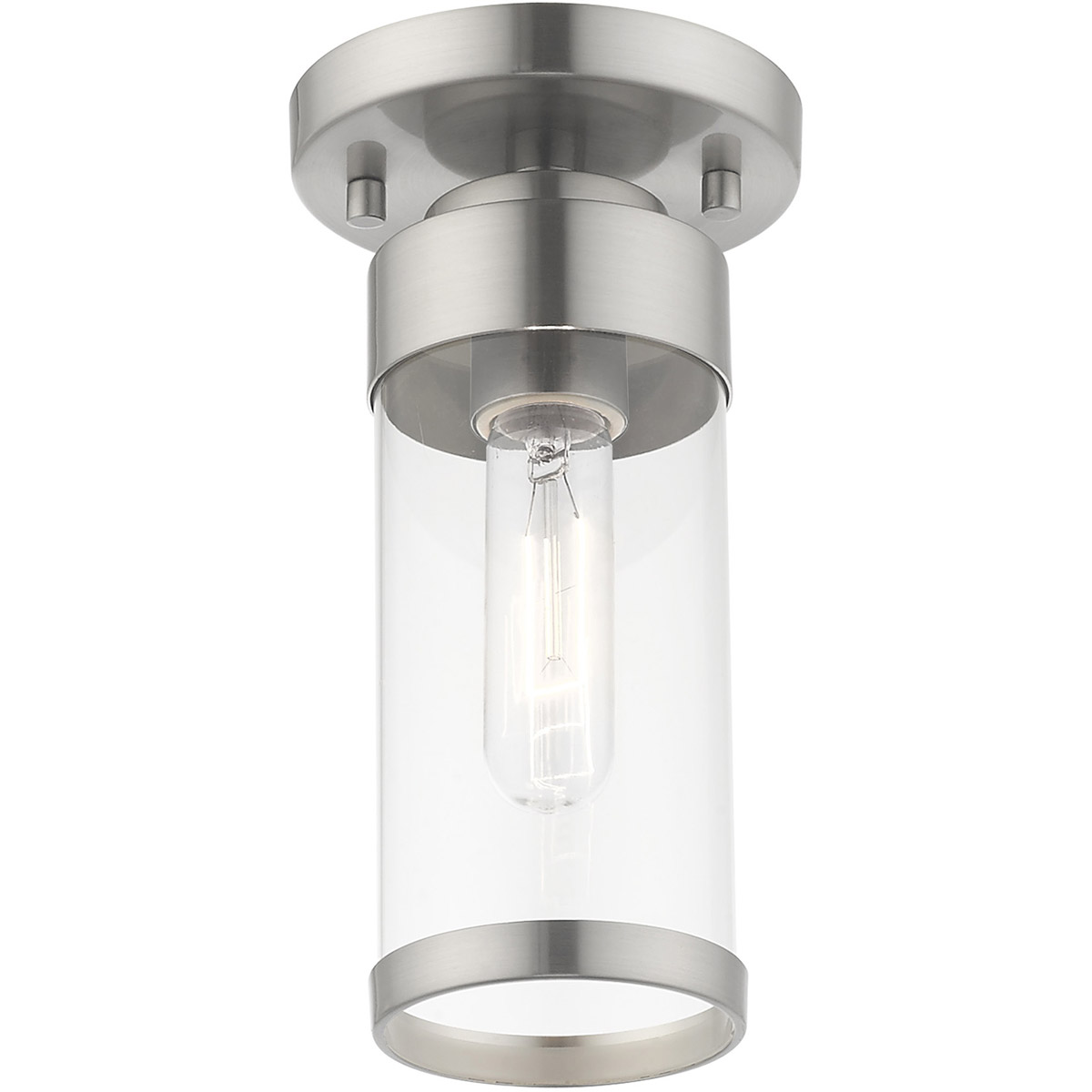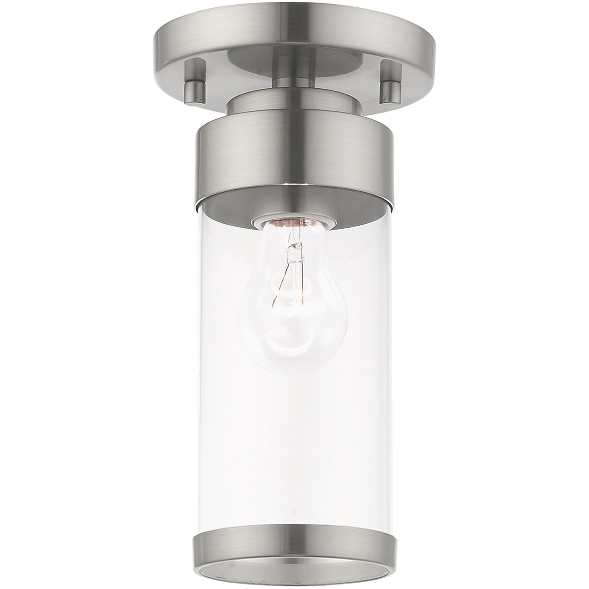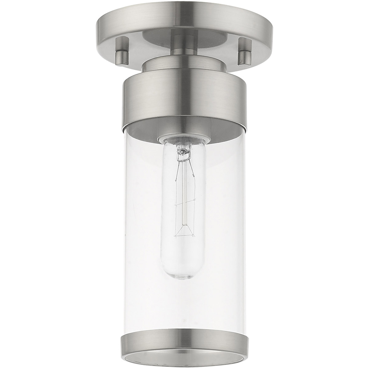 The one light ceiling mount from the Hillcrest collection features a simple elegant brushed nickel frame paired with clear glass shades. Each shade is accented with a banded brushed nickel ring to carry through the theme of finely crafted metal fittings.