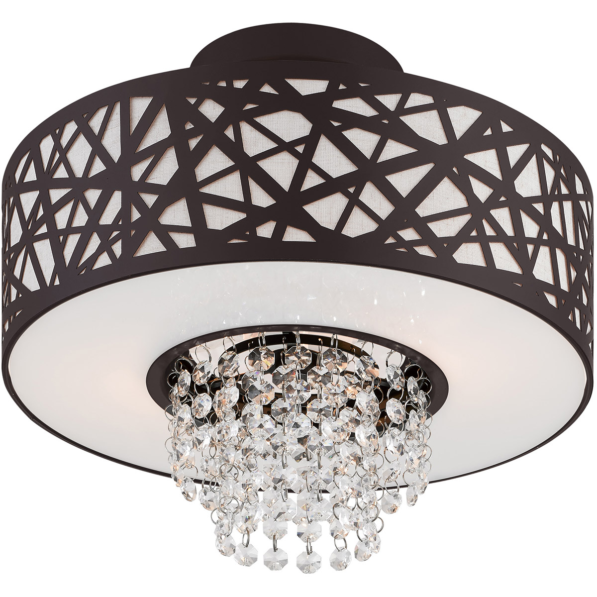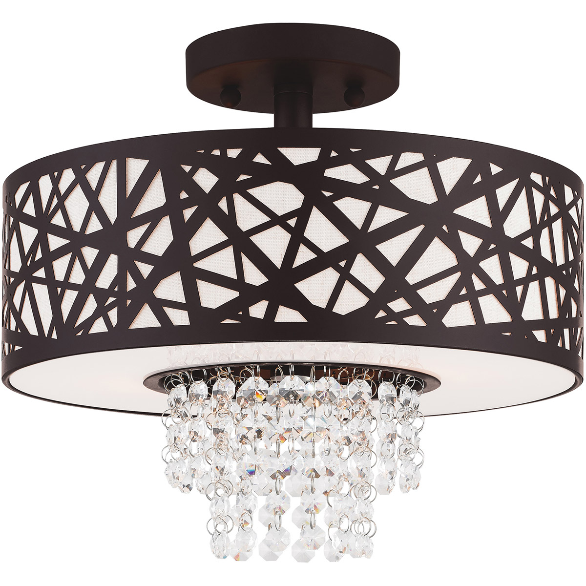 This spectacular bronze two light semi flush mount will take your home decor to the next level. Inspired by a bird nest, the laser-cut metal sheath surrounds an oatmeal fabric hardback shade with strands glistening of clear crystal.