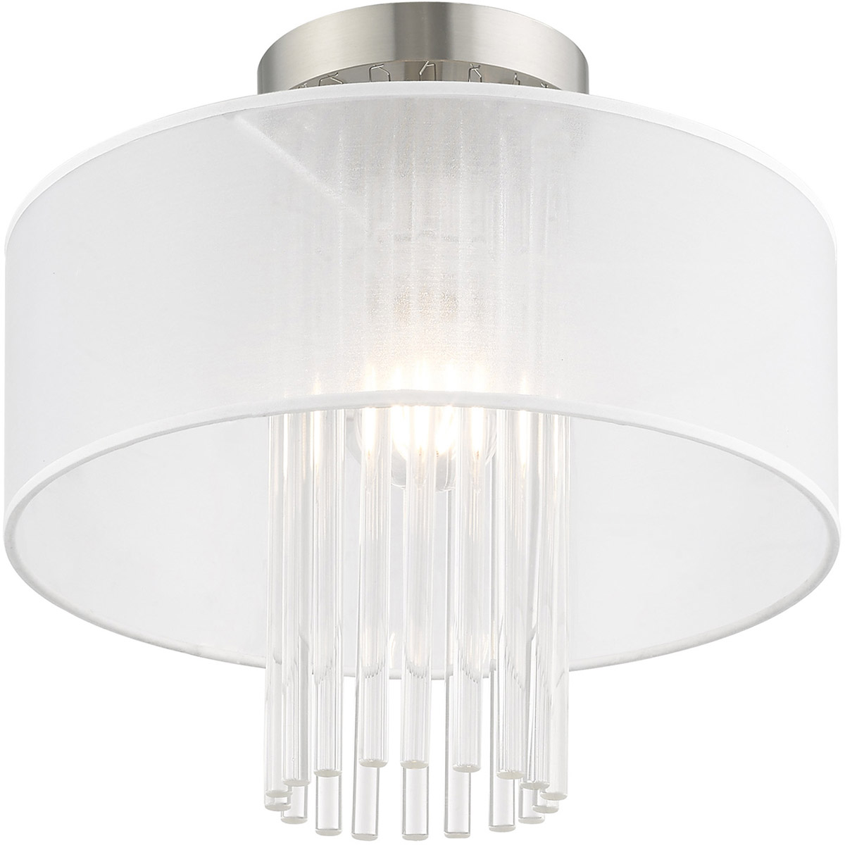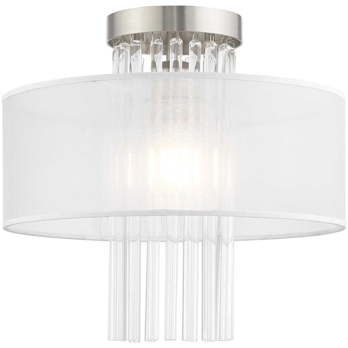 Dazzle contemporary decor schemes with the upscale feel of this elegant ceiling mount. The Alexis fills a bling quotient with beautiful grade-A K9 crystal rods that cascades from a brushed nickel base with a hand crafted translucent fabric shade.
