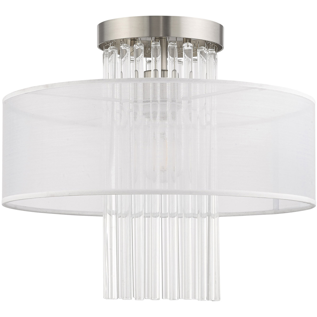 Dazzle contemporary decor schemes with the upscale feel of this elegant ceiling mount. The Alexis fills a bling quotient with beautiful grade-A K9 crystal rods that cascades from a brushed nickel base with a hand crafted translucent fabric shade.