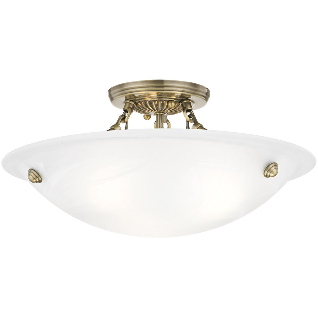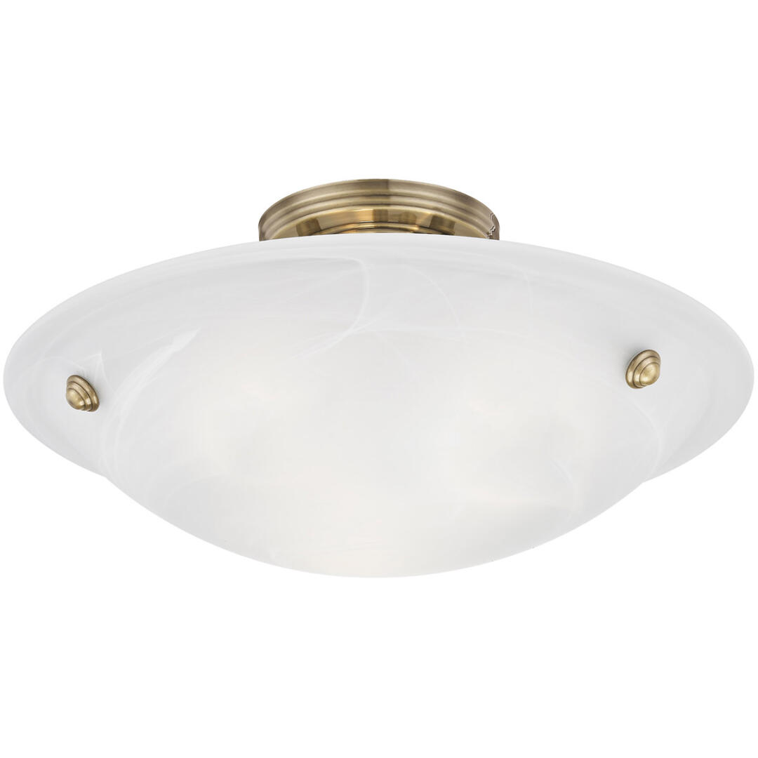 This ceiling mount features contour lines and a bowed profile. With an understated design, this piece is perfect for any space in your home. Featuring a white alabaster glass and antique brass finish, this fixture will effortlessly blend with your existing décor.