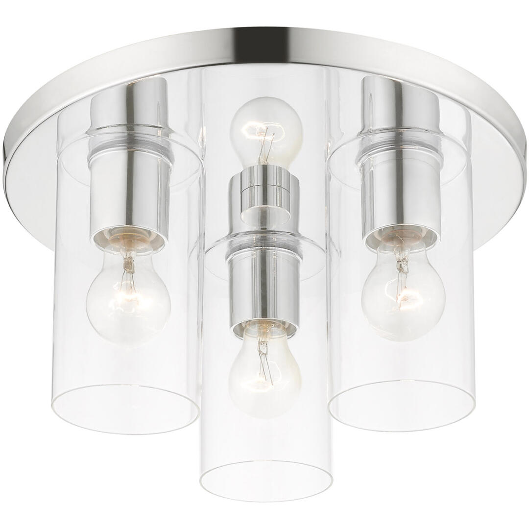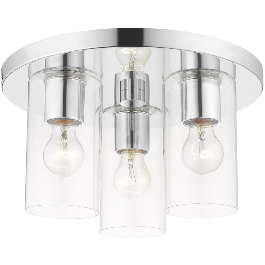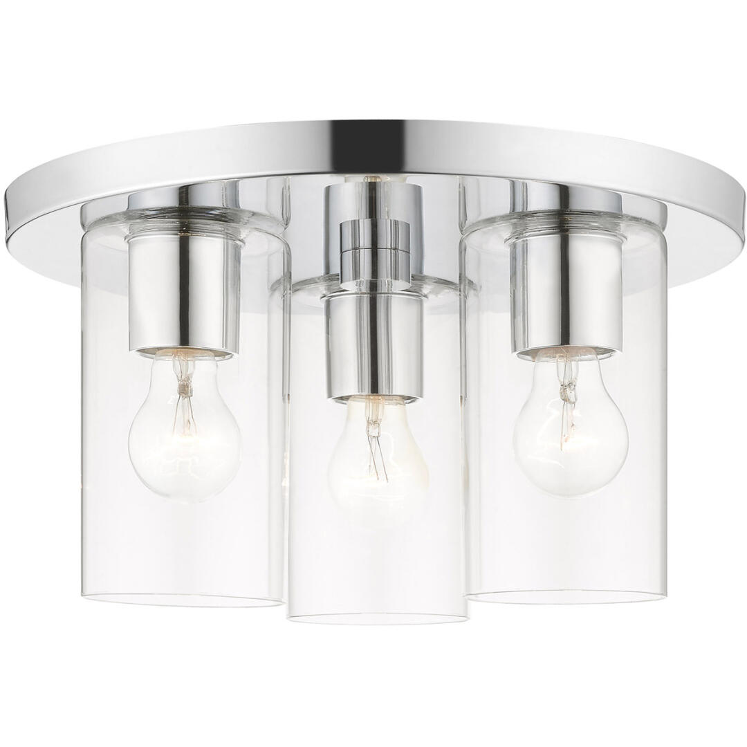 Illuminate your home with a bright design from the Zurich collection. This large three-light flush mount features a polished chrome finish with clear glass. Perfect for a contemporary or transitional luxury bathroom, bedroom, kitchen or hallway setting.