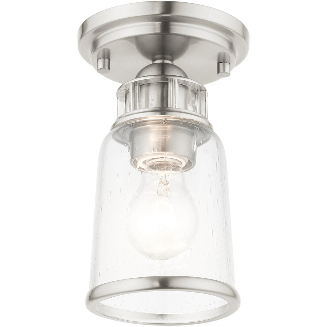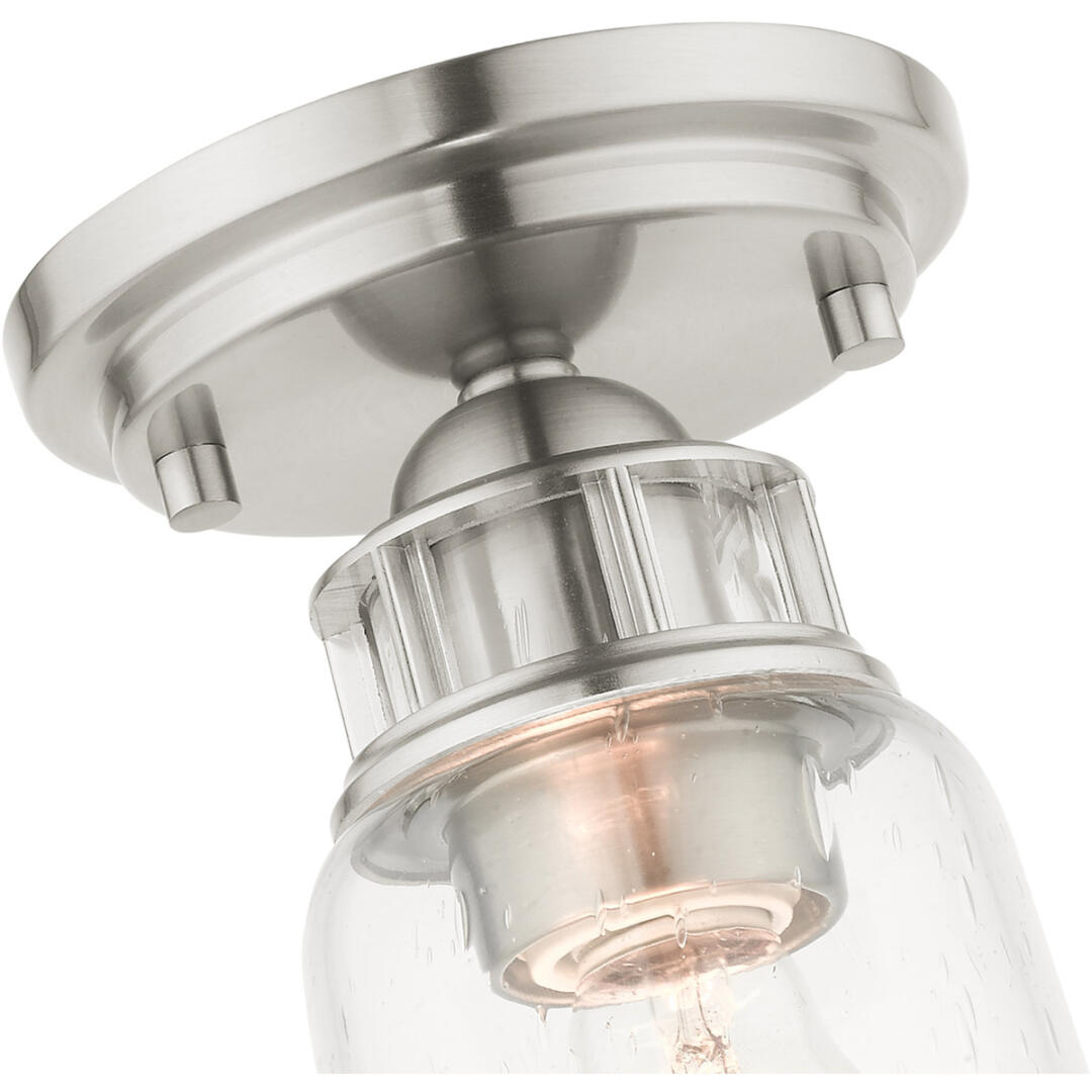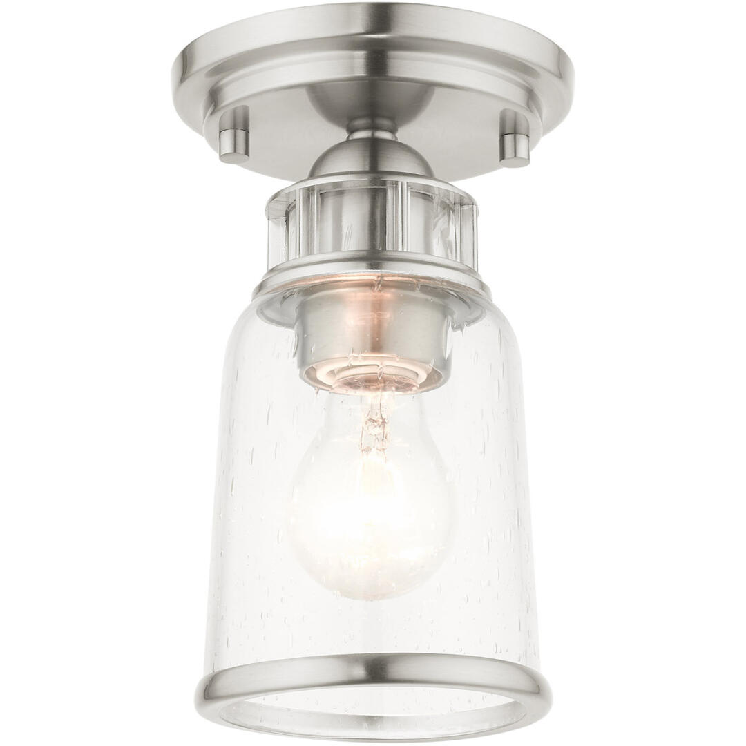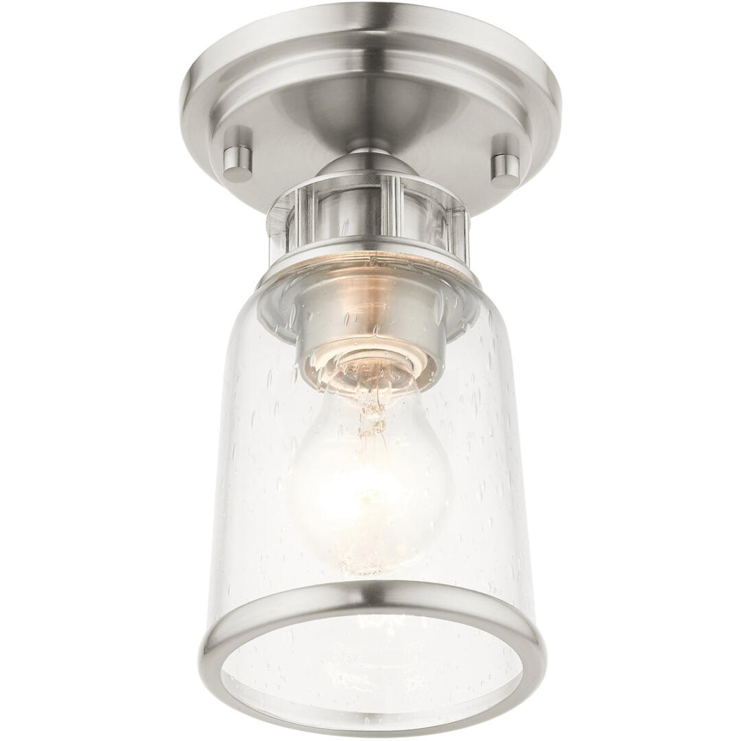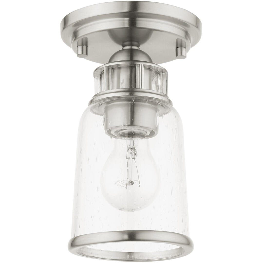 Reminiscent of turn of the 19th century lighting, the Lawrenceville collection highlights a retro industrial design featuring clear seeded glass and a brushed nickel finish. This single light flush mount fixture easily fits into industrial, transitional and modern classic kitchens, hallways or bathrooms.