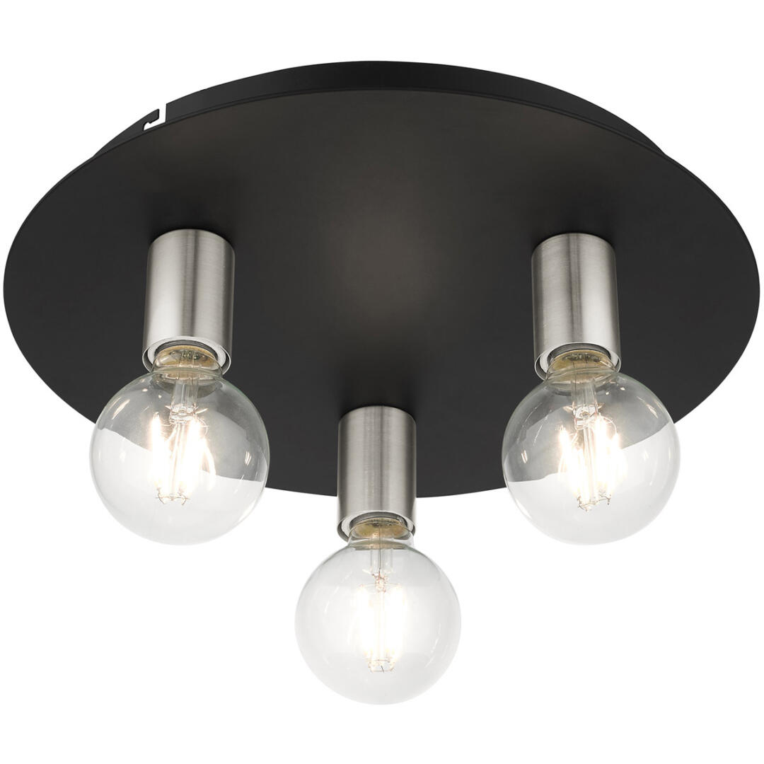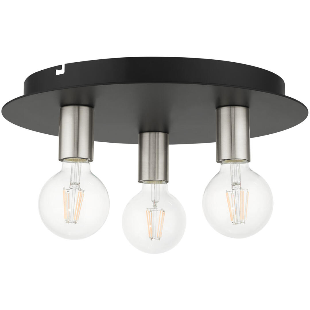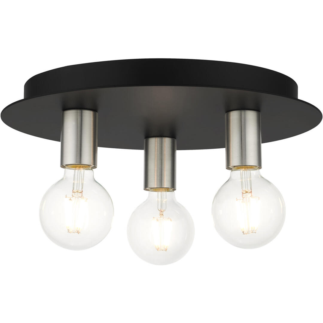 Minimal and versatile describes the Hillview collection. Two-tone finishes grace this group creating a stylish and sophisticated appearance. This three-light flush mount ceiling fixture will look great in a traditional, transitional, modern or contemporary bedroom, hallway, bathroom and kitchen. It is shown in a black finish with brushed nickel finish accents.