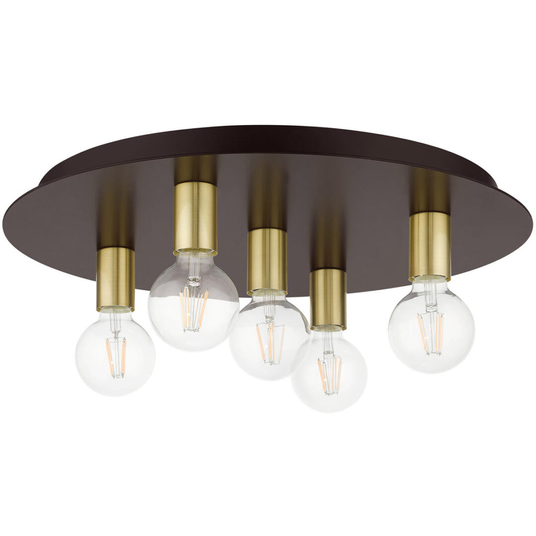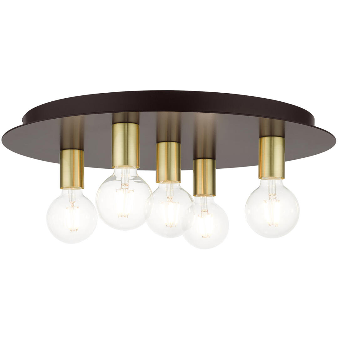 Minimal and versatile describes the Hillview collection. Two-tone finishes grace this group creating a stylish and sophisticated appearance. This five-light flush mount ceiling fixture will look great in a traditional, transitional, modern or contemporary bedroom, hallway, bathroom and kitchen. It is shown in a bronze finish with satin brass finish accents.