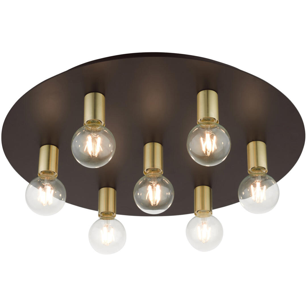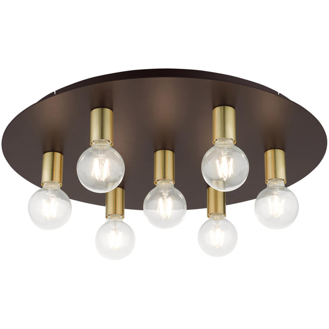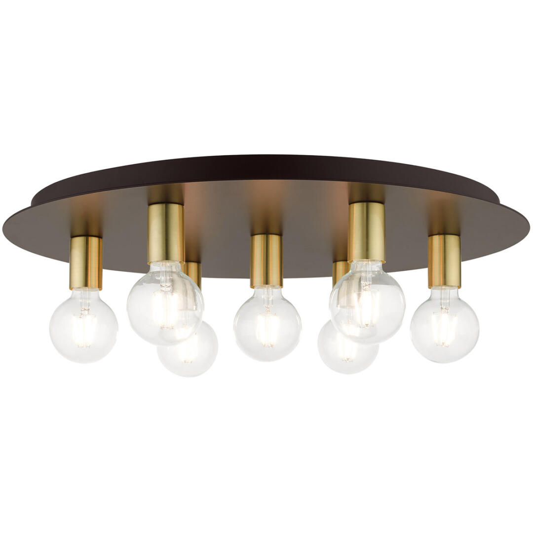 Minimal and versatile describes the Hillview collection. Two-tone finishes grace this group creating a stylish and sophisticated appearance. This seven-light flush mount ceiling fixture will look great in a traditional, transitional, modern or contemporary bedroom, hallway, bathroom and kitchen. It is shown in a bronze finish with satin brass finish accents.