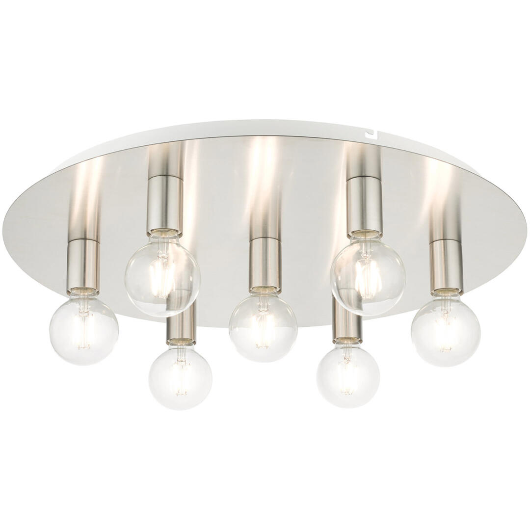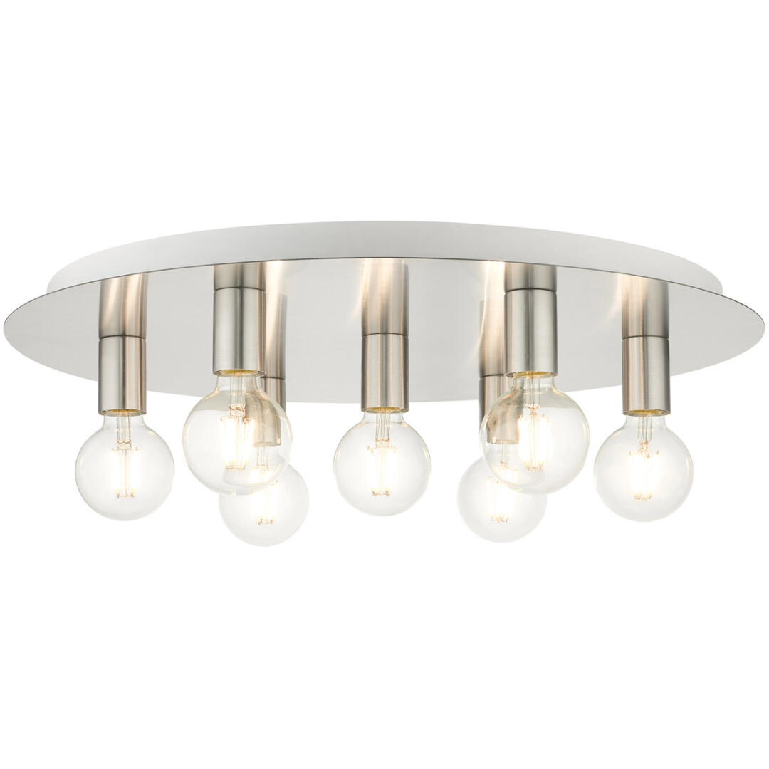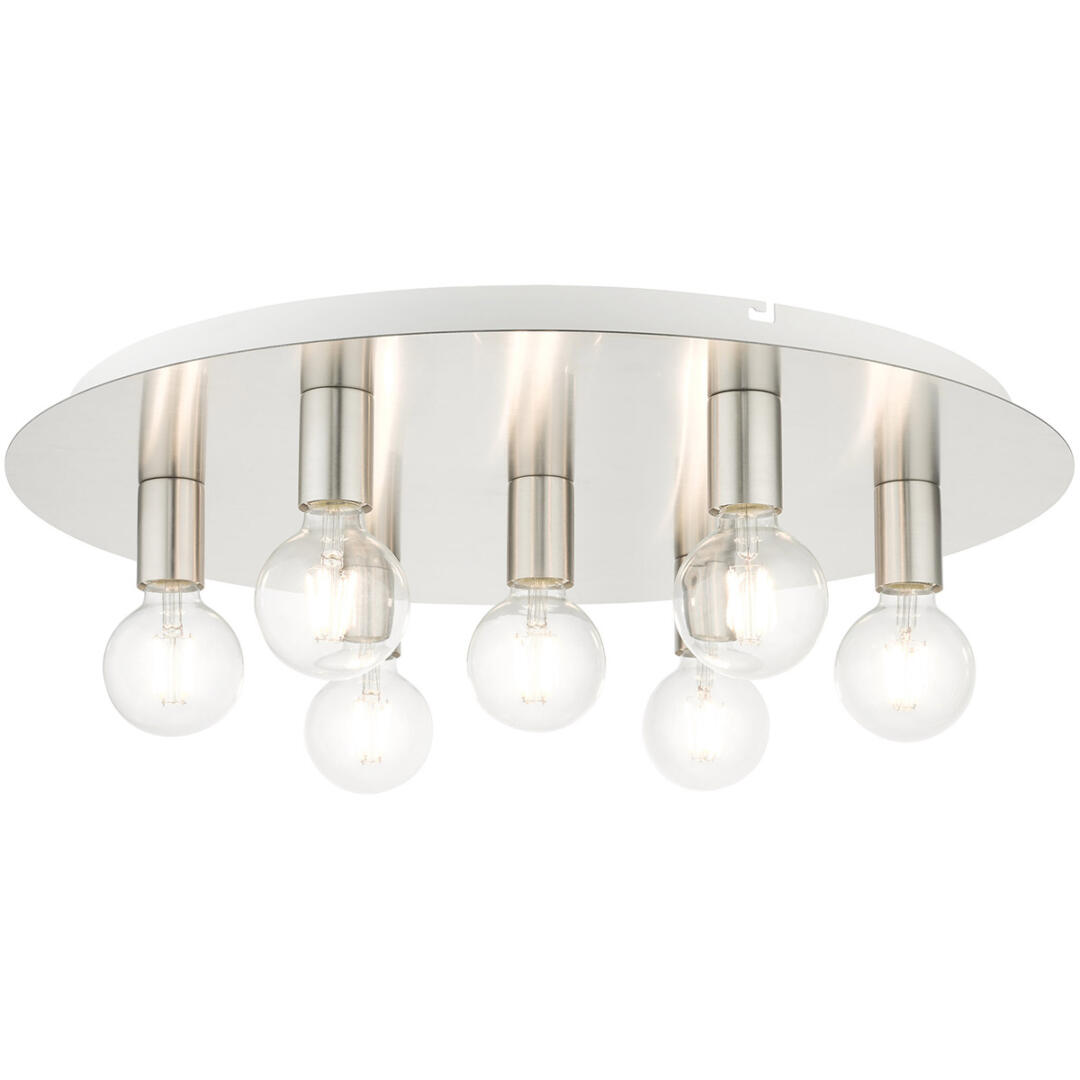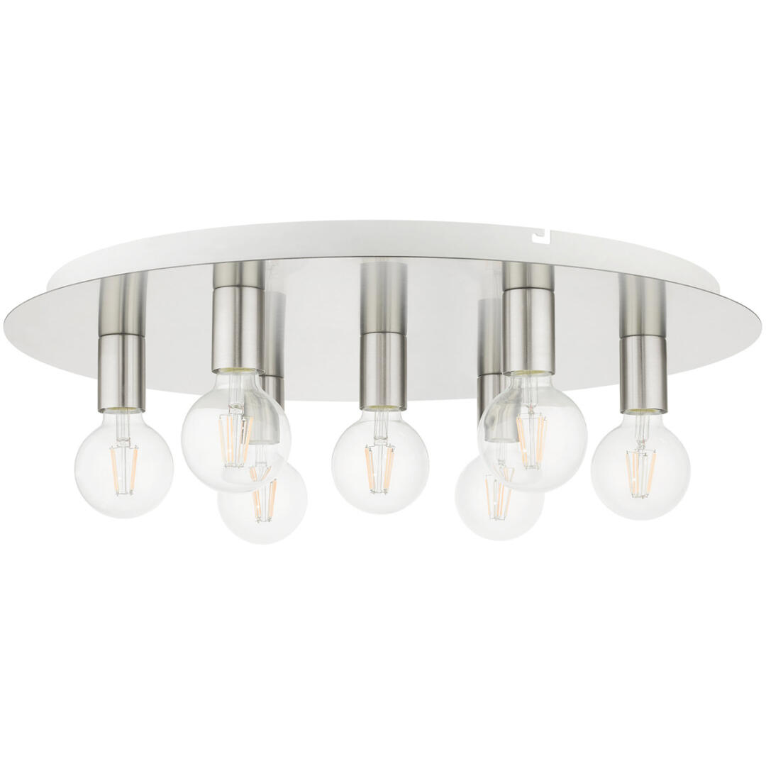 Minimal and versatile describes the Hillview collection. Two-tone finishes grace this group creating a stylish and sophisticated appearance. This seven-light flush mount ceiling fixture will look great in a traditional, transitional, modern or contemporary bedroom, hallway, bathroom and kitchen. It is shown in a brushed nickel finish with white finish canopy.