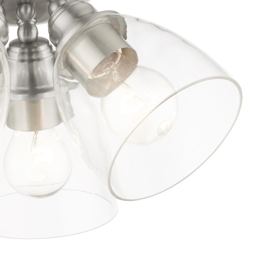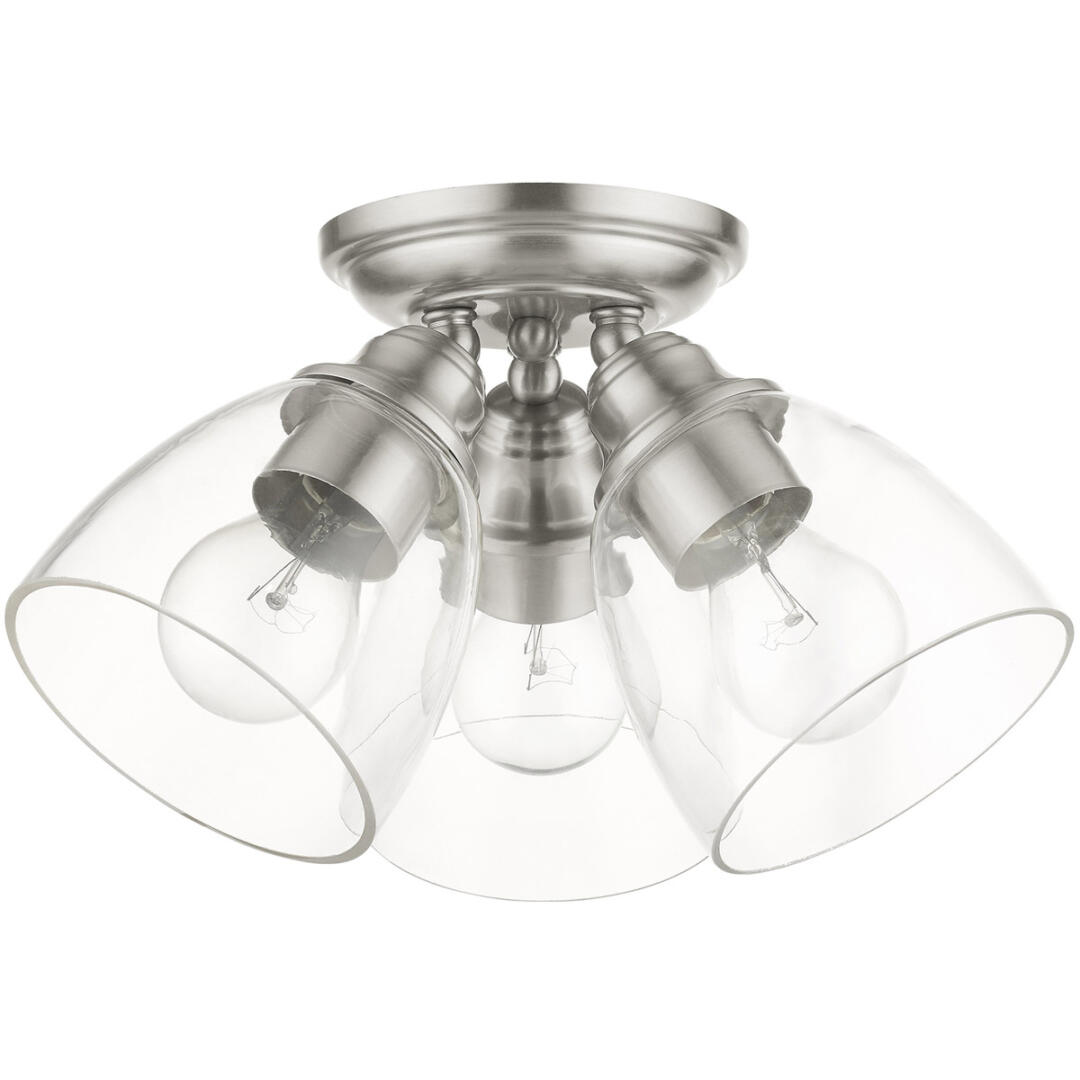 Whether it’s style or practical lighting, this flush mount is the perfect addition to your bathroom, kitchen, hallway or bedroom. This three-light fixture from the Montgomery Collection features clear hand-blown glass shades and is shown in a brushed nickel finish. The clean graceful lines of the canopy complement the shades, creating an understated look that works well in most decors. Classic elegance combines with contemporary appeal to enhance any home in style.