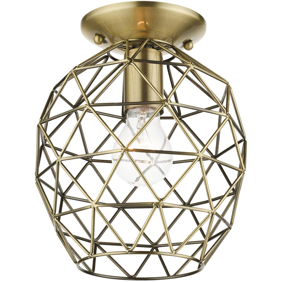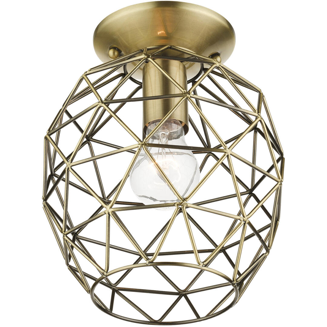 The Geometrix collection adds a stylish touch of contemporary inspiration featuring a classic geometric cage design. This antique brass finish single-light flush mount will fit comfortably almost into any room décor. With superb craftsmanship and affordable price, this fixture is sure to tastefully enhance your lifestyle.