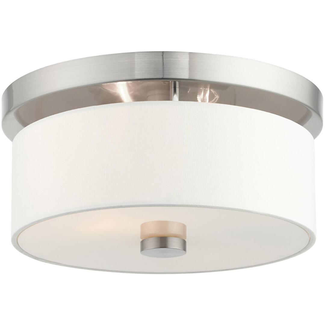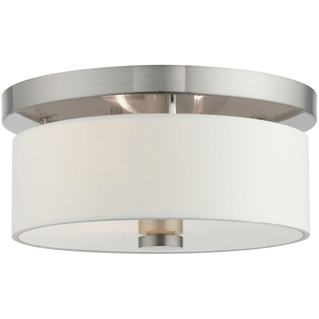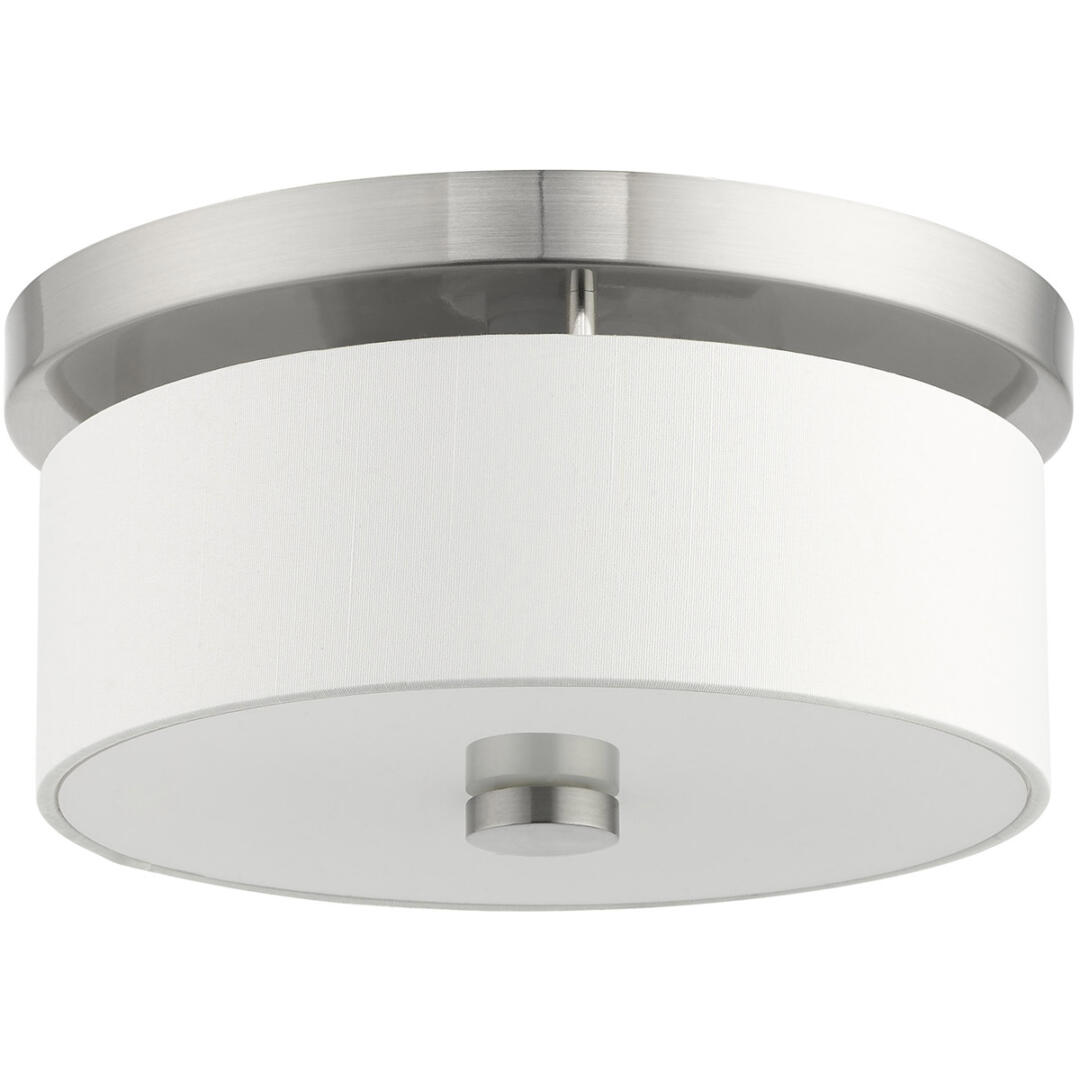 This timeless, transitional style flush mount is great for any style of decor. An hand crafted off white fabric hardback shade is paired handsomely with an brushed nickel finish, so you can give your home warm, even illumination. Perfect for entryways, hallways, and more.