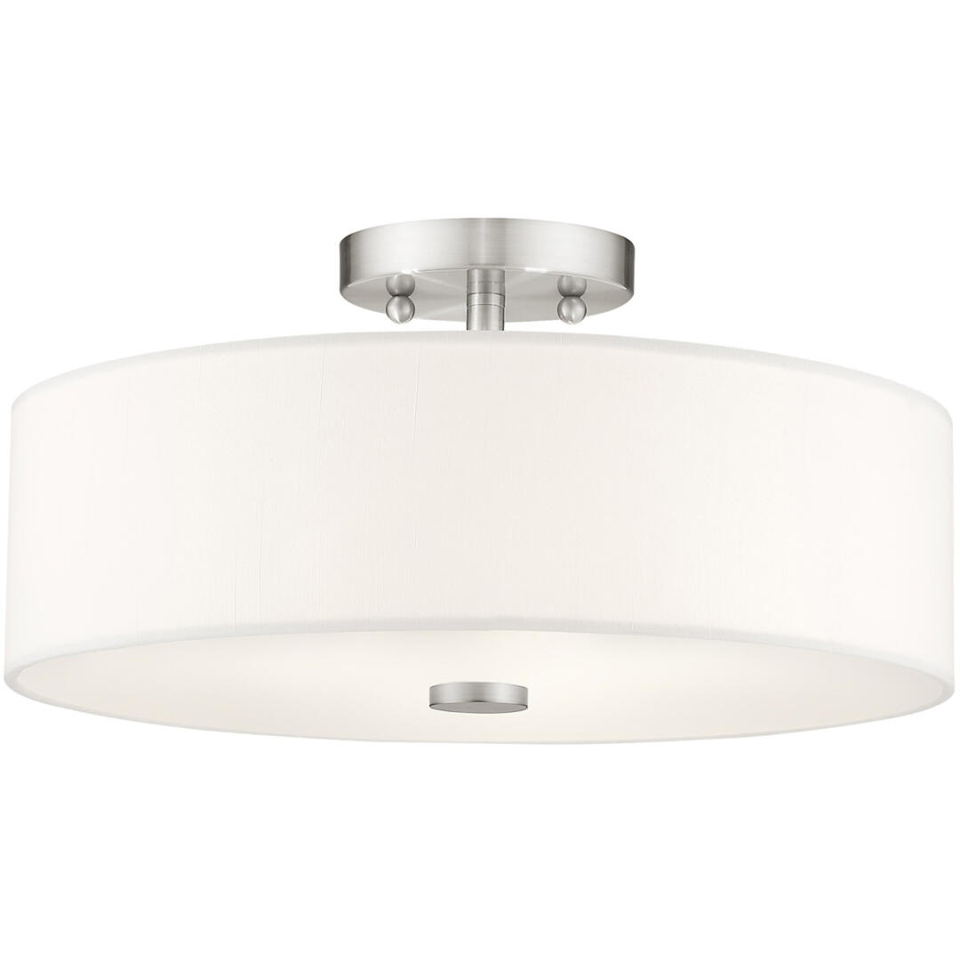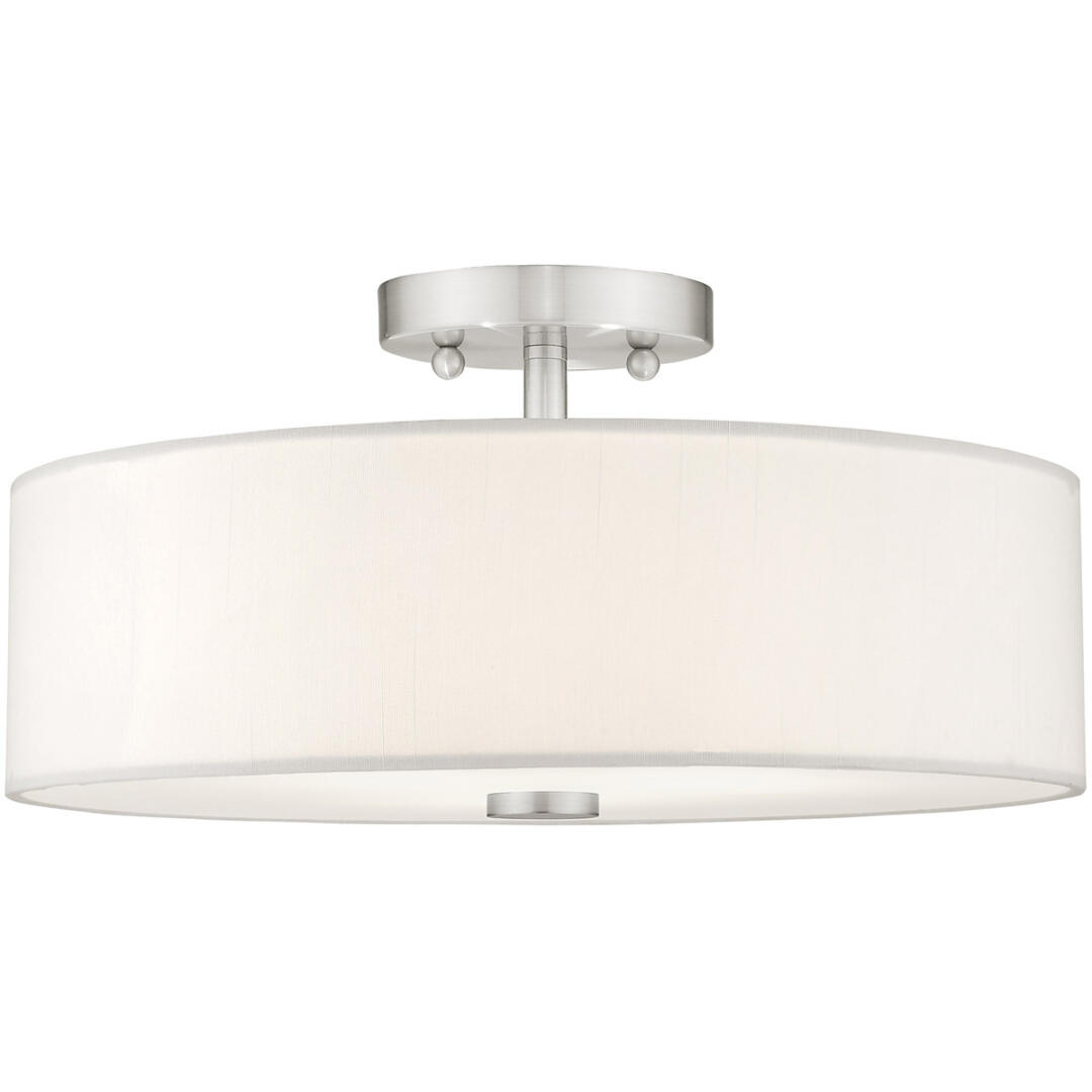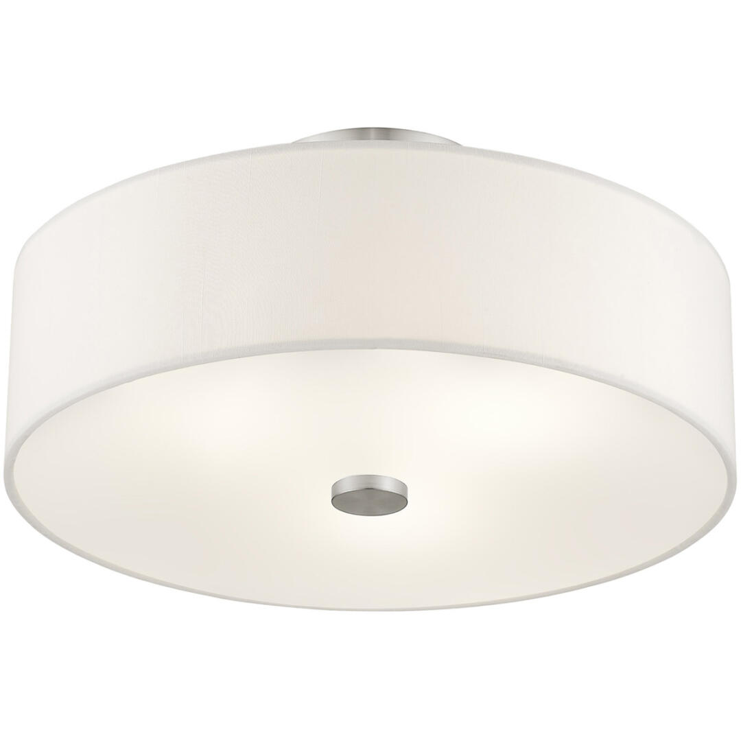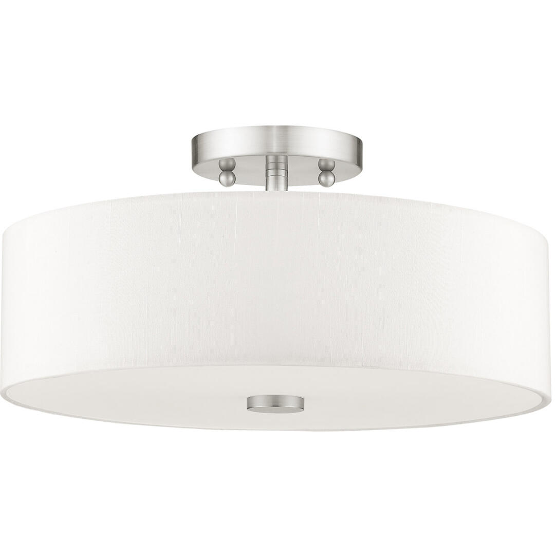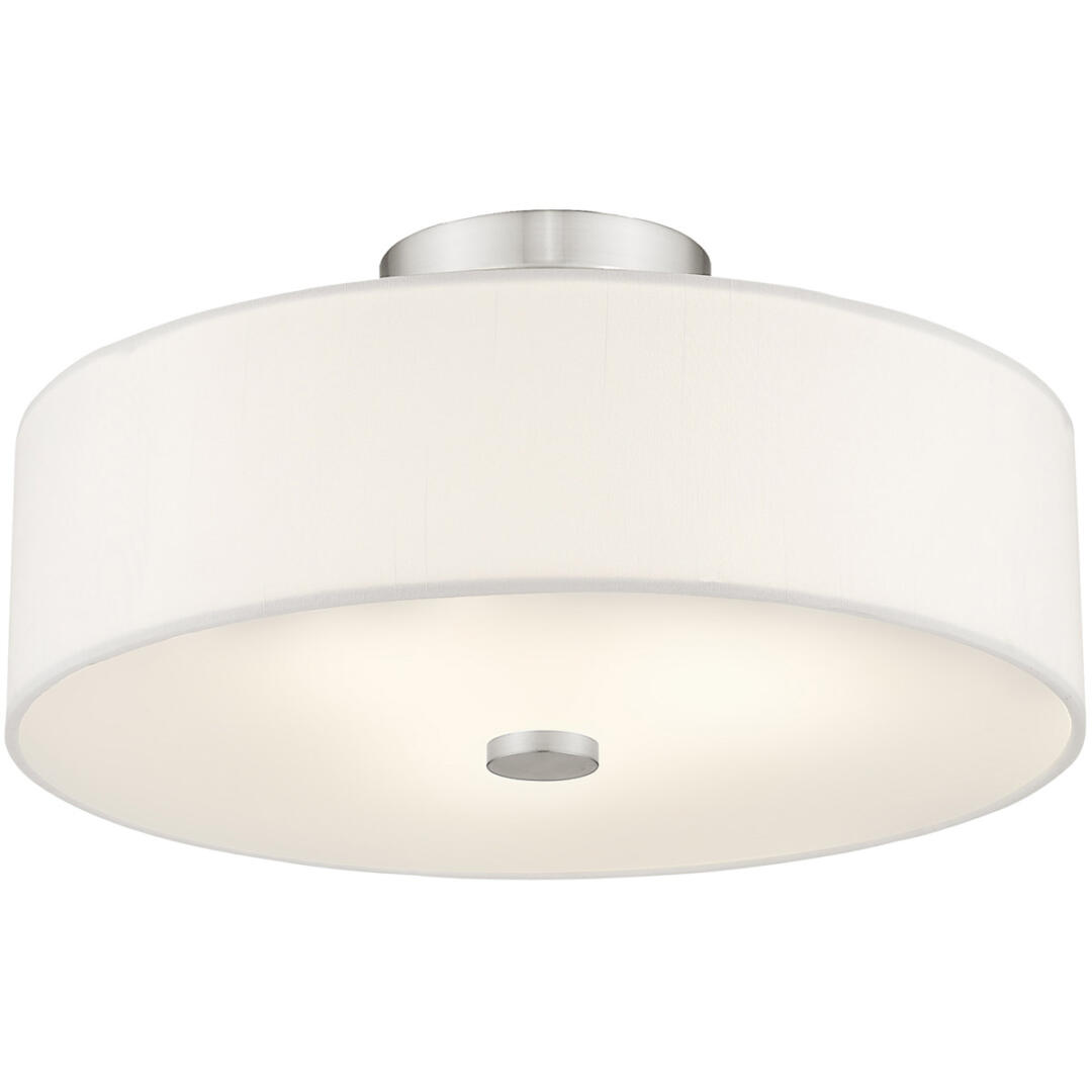 Add style to any room with this elegant semi flush mount. The design features a beautiful hand crafted off white fabric hardback drum shade in a stylish brushed nickel.