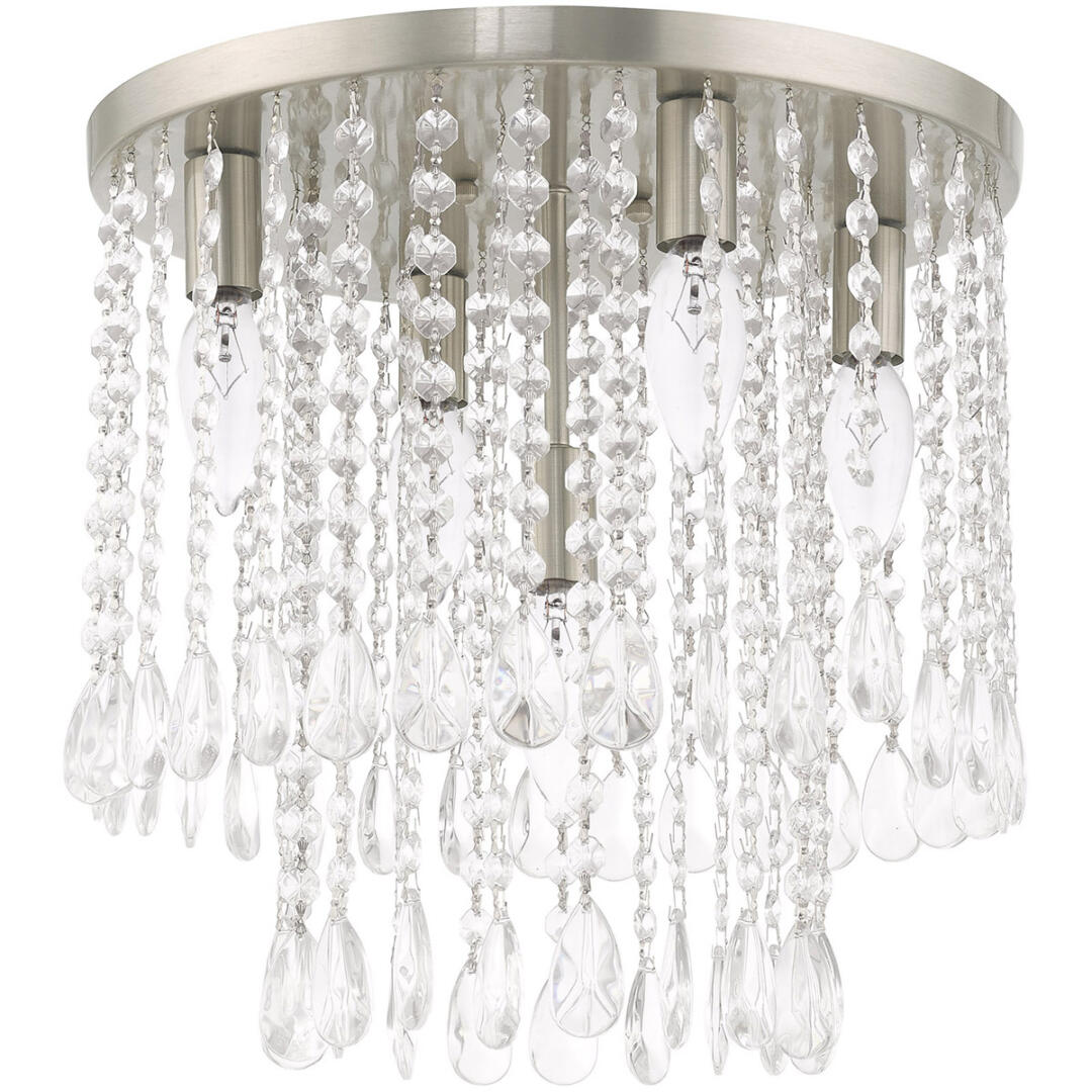 The brushed nickel finish decorates the beautiful design of the Elizabeth five light ceiling mount with a refined quality. Clear crystal frills offer detailed elegance to the design of this ceiling light. Attract attention with the bold personality provided by this lovely fixture.