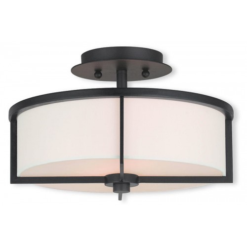 A handsome semi flush mount in warm, natural tones. This semi flush mount light will instantly transform a room from dreary to chic. The bronze finish on the frame complements the exquisite, hand crafted off white hardback drum shade and a satin opal glass diffuser guarantees a soft illumination.