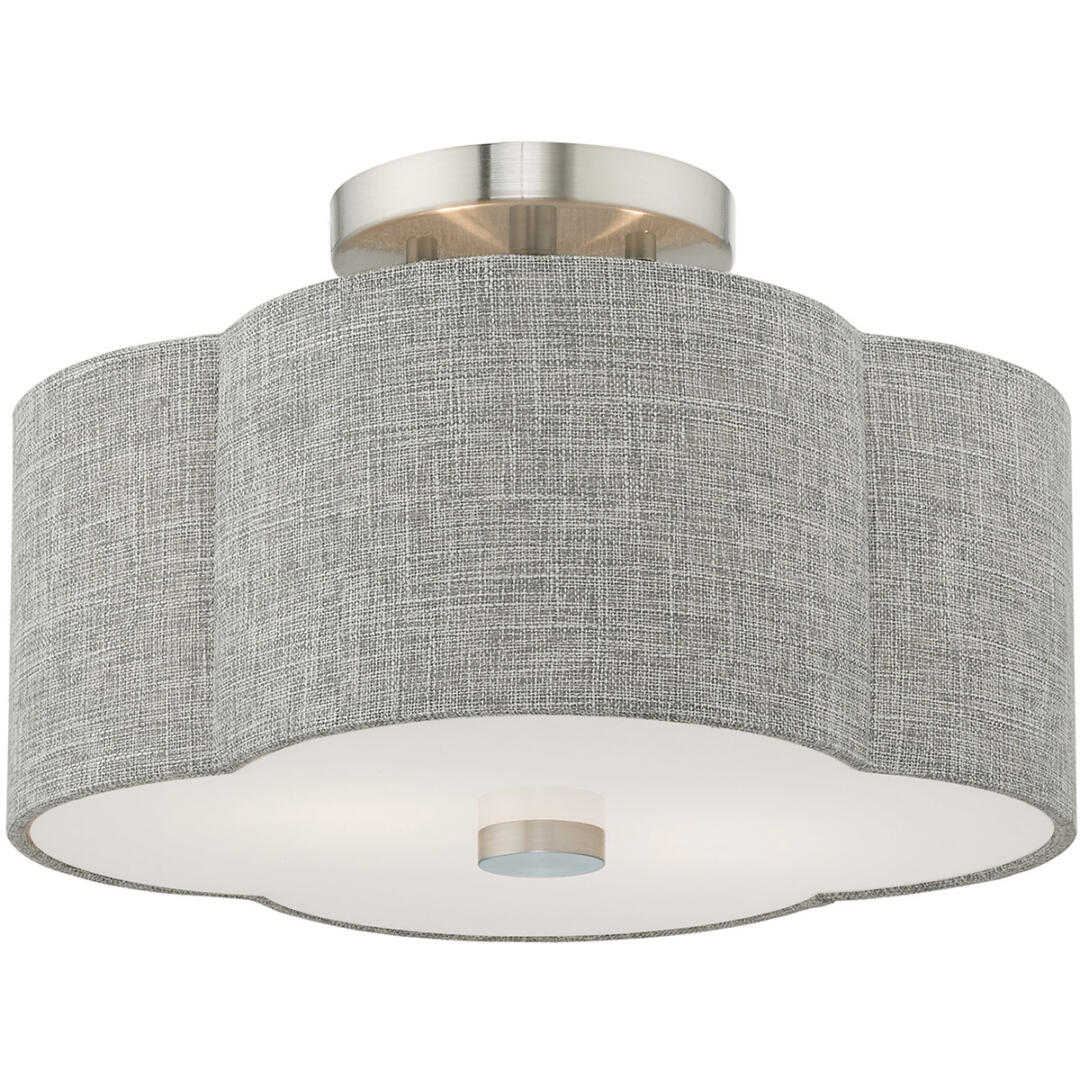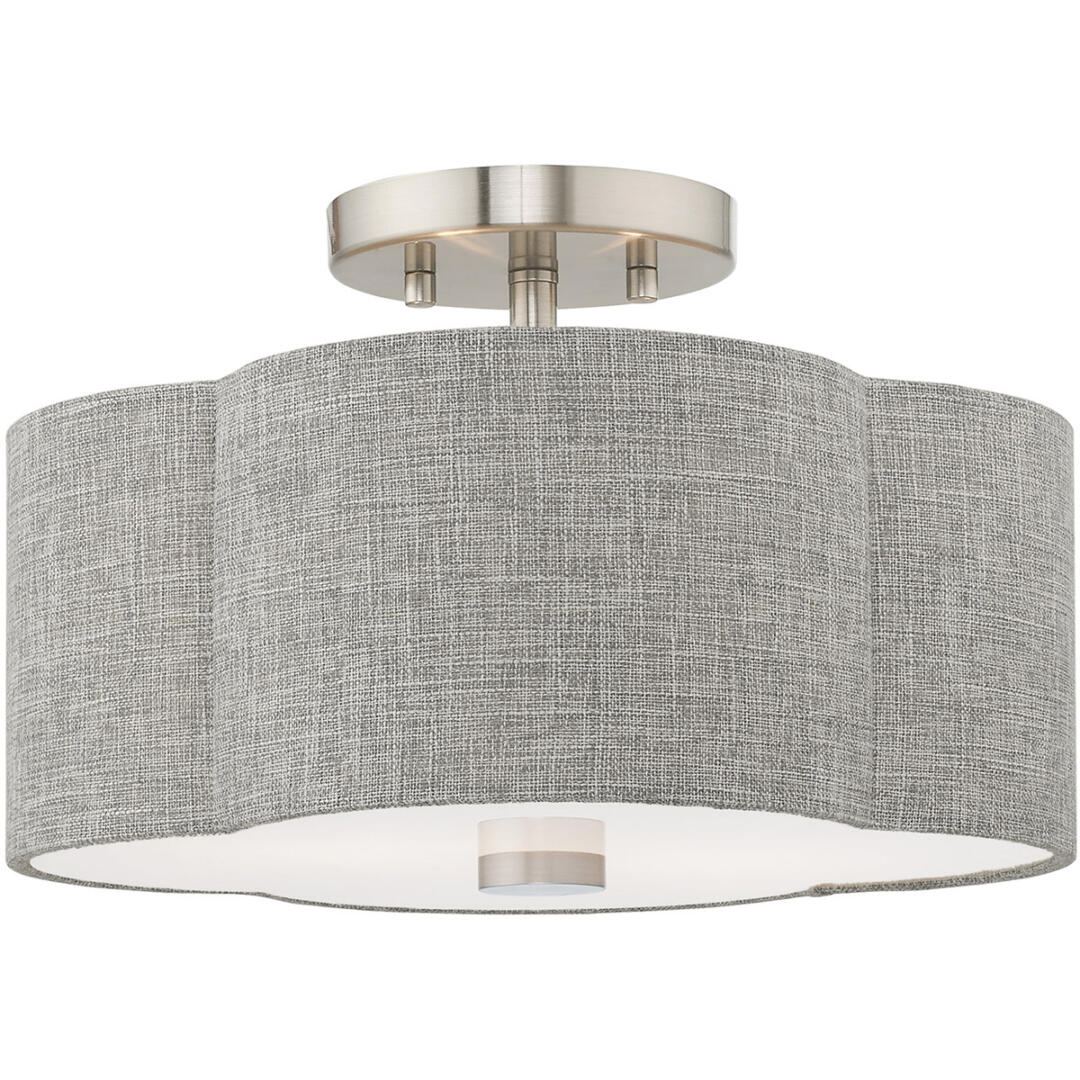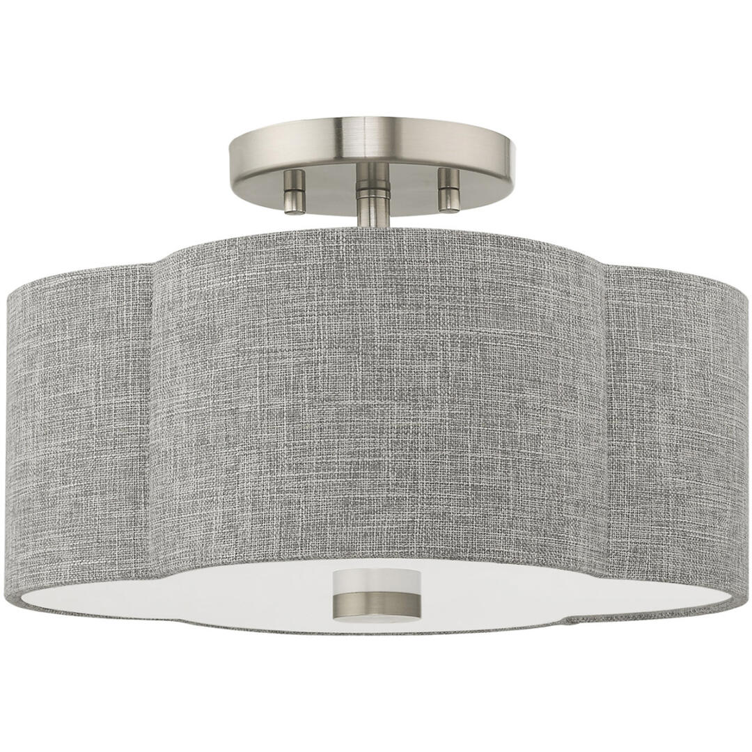 The brushed nickel frame gives the Kalmar two light ceiling mount a clean, modern feel while the cool, clover shaped gray hand crafted hardback drum shade adds an unexpected splash of fun.
