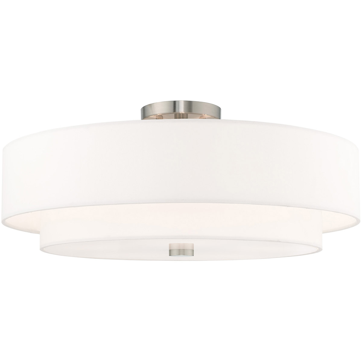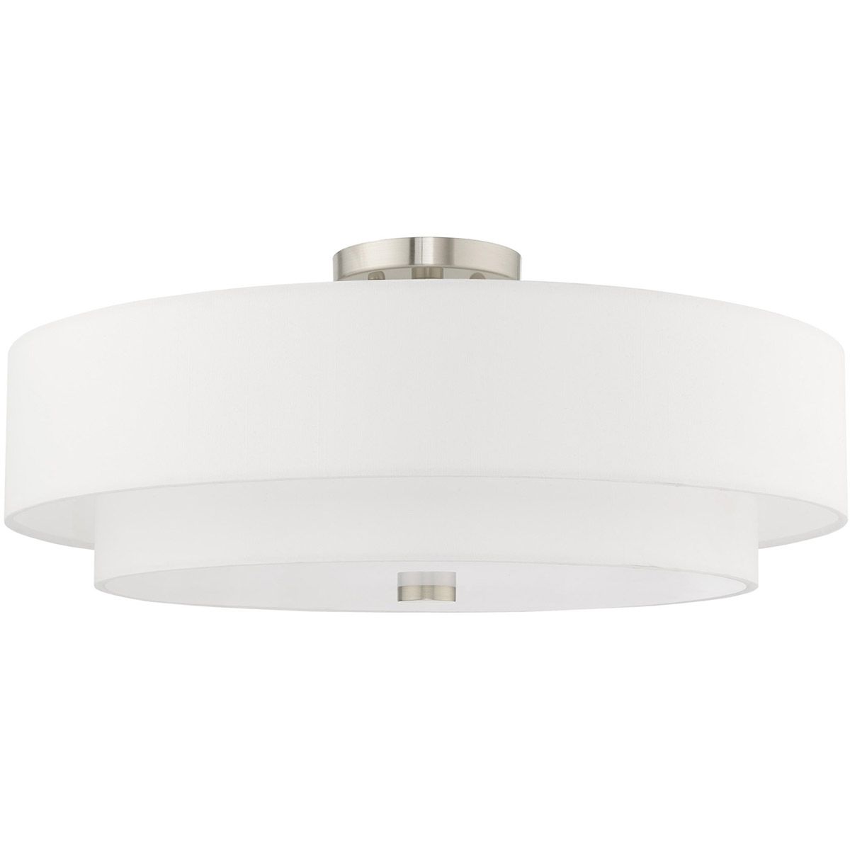 A double drum shade adds character to this handsomely styled semi flush mount. Update your decor with the clean styling of this contemporary five light flush mount from the Meridian collection. Features a lovely hand crafted off-white fabric hardback shade and frosted diffuser for subtle illumination.