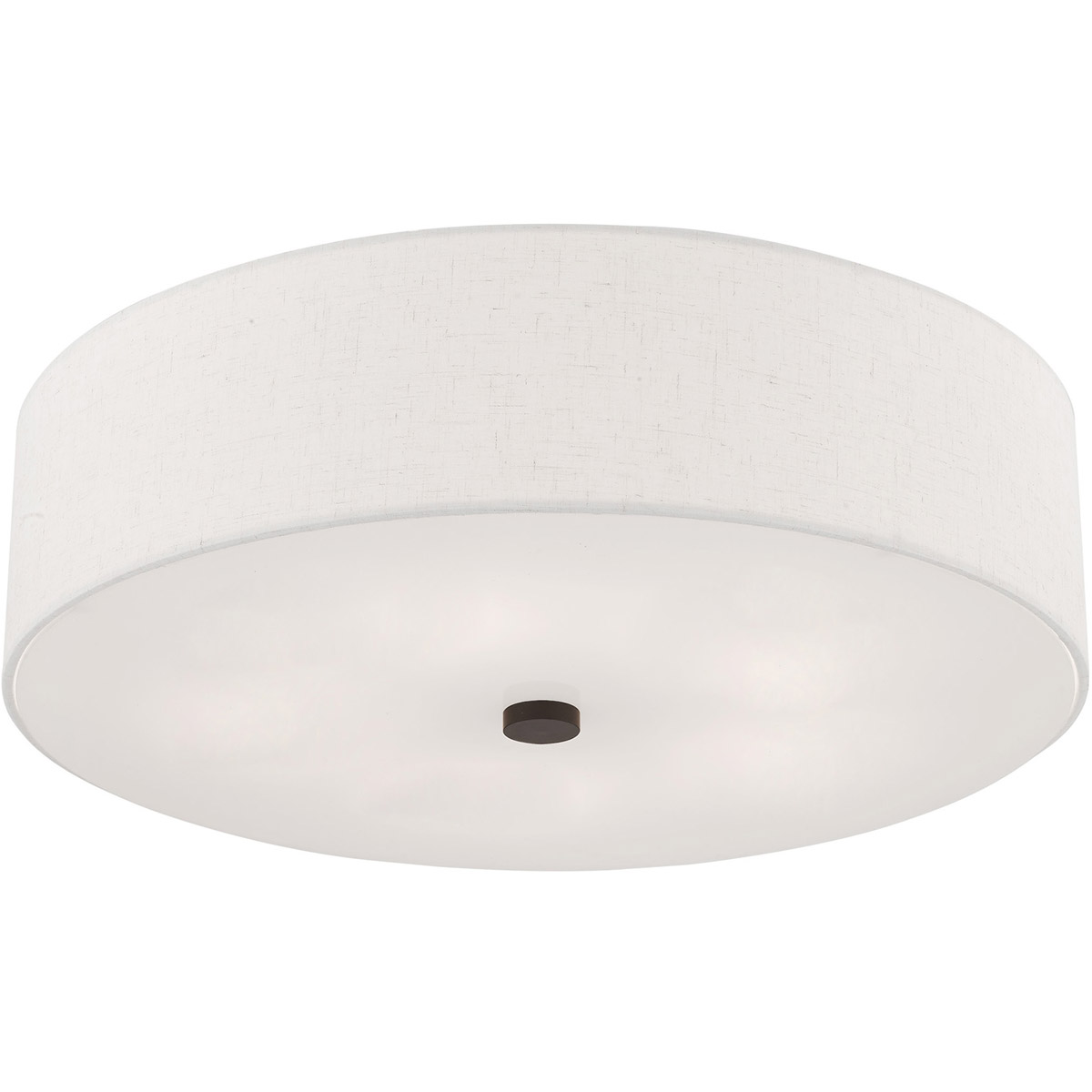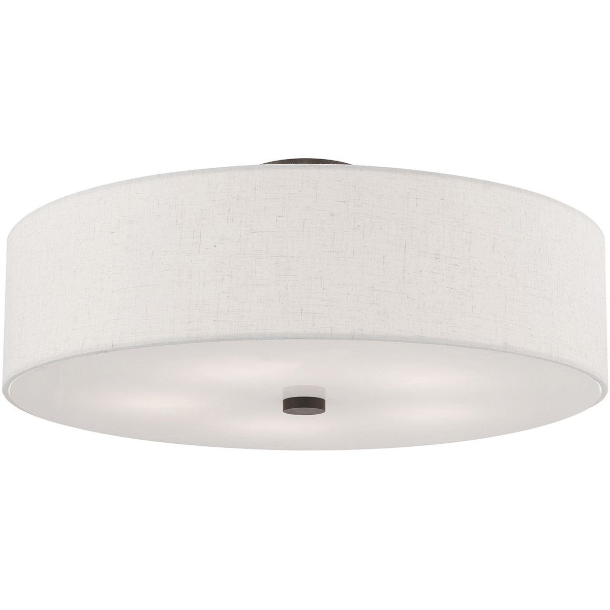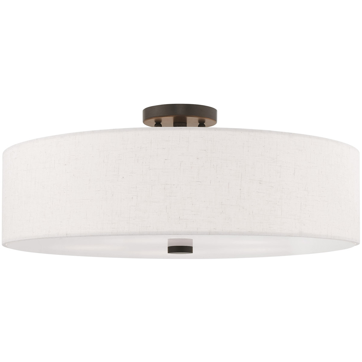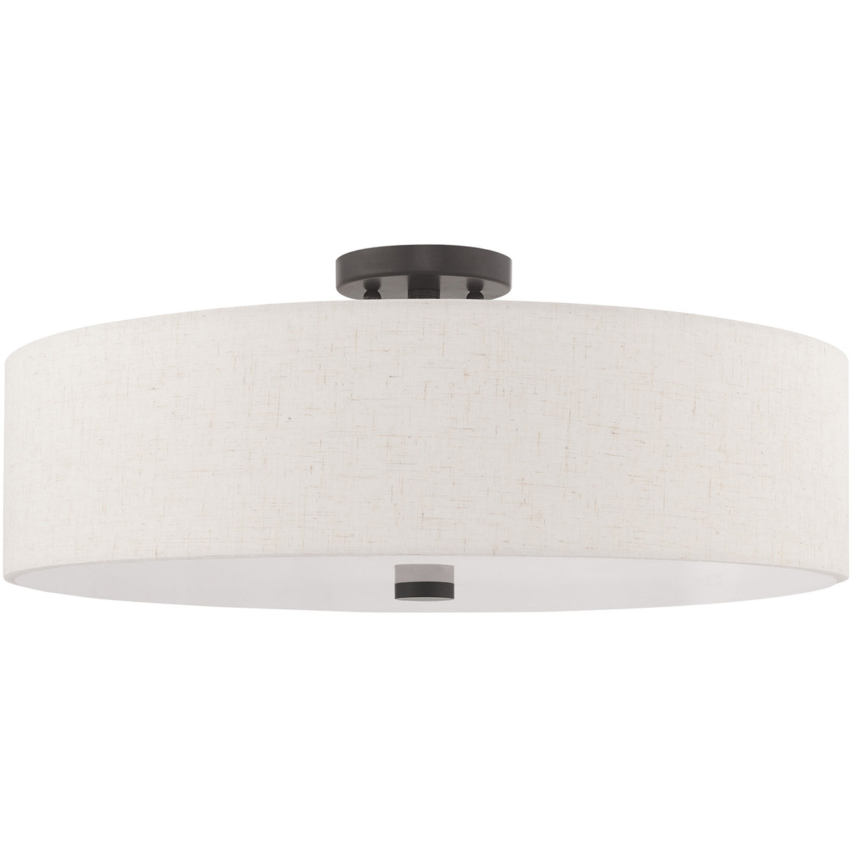 Add style to any room with this elegant semi flush mount. The design features a beautiful hand crafted oatmeal fabric hardback drum shade in a stylish English bronze.
