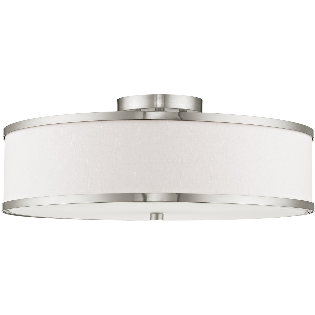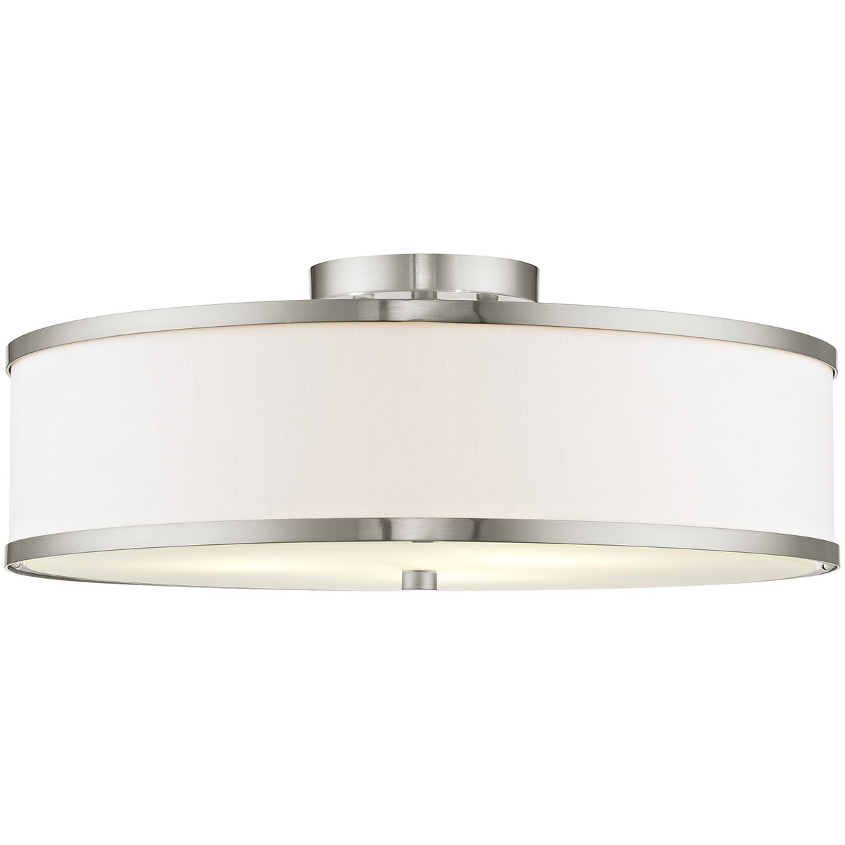 Update your decor with this sleek semi flush mount design. The shaded frame comes in a brushed nickel finish which nicely complements the hand crafted white hardback shade.