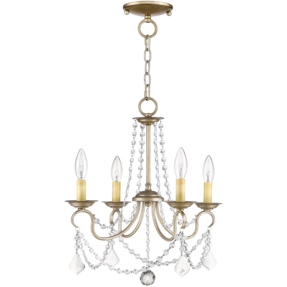 This intricately accented and masterfully forged four light mini chandelier is from the Pennington collection. Finish is an antique silver leaf and features include gracefully sculpted arms and with sparkling clear crystal.