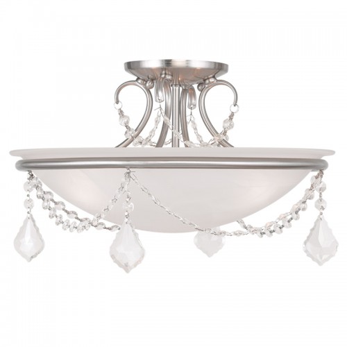 This intricately accented and masterfully forged three light semi flush mount is from the Pennington collection. Finish is a brushed nickel and features include gracefully sculpted arms, sparkling clear crystal and white alabaster glass.