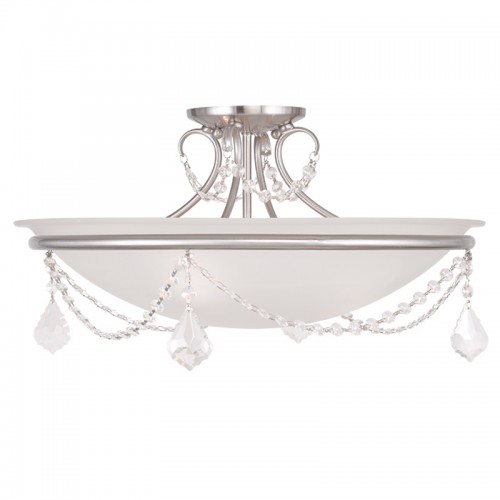 This intricately accented and masterfully forged three light semi flush mount is from the Pennington collection. Finish is a brushed nickel and features include gracefully sculpted arms, sparkling clear crystal and white alabaster glass.
