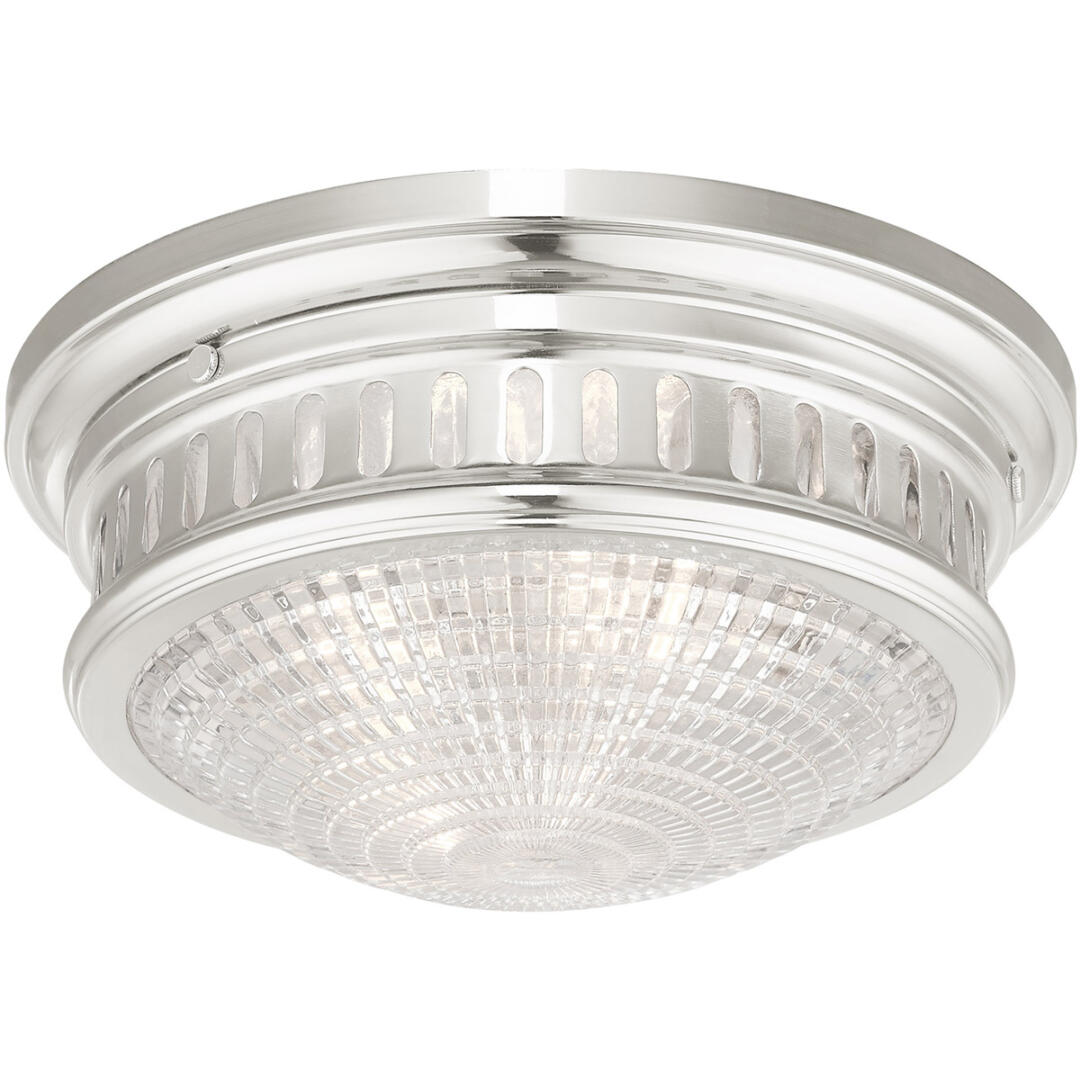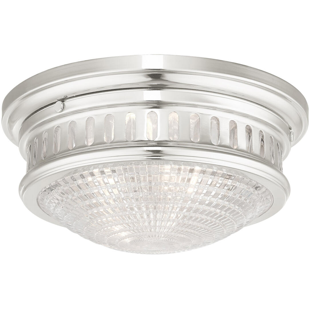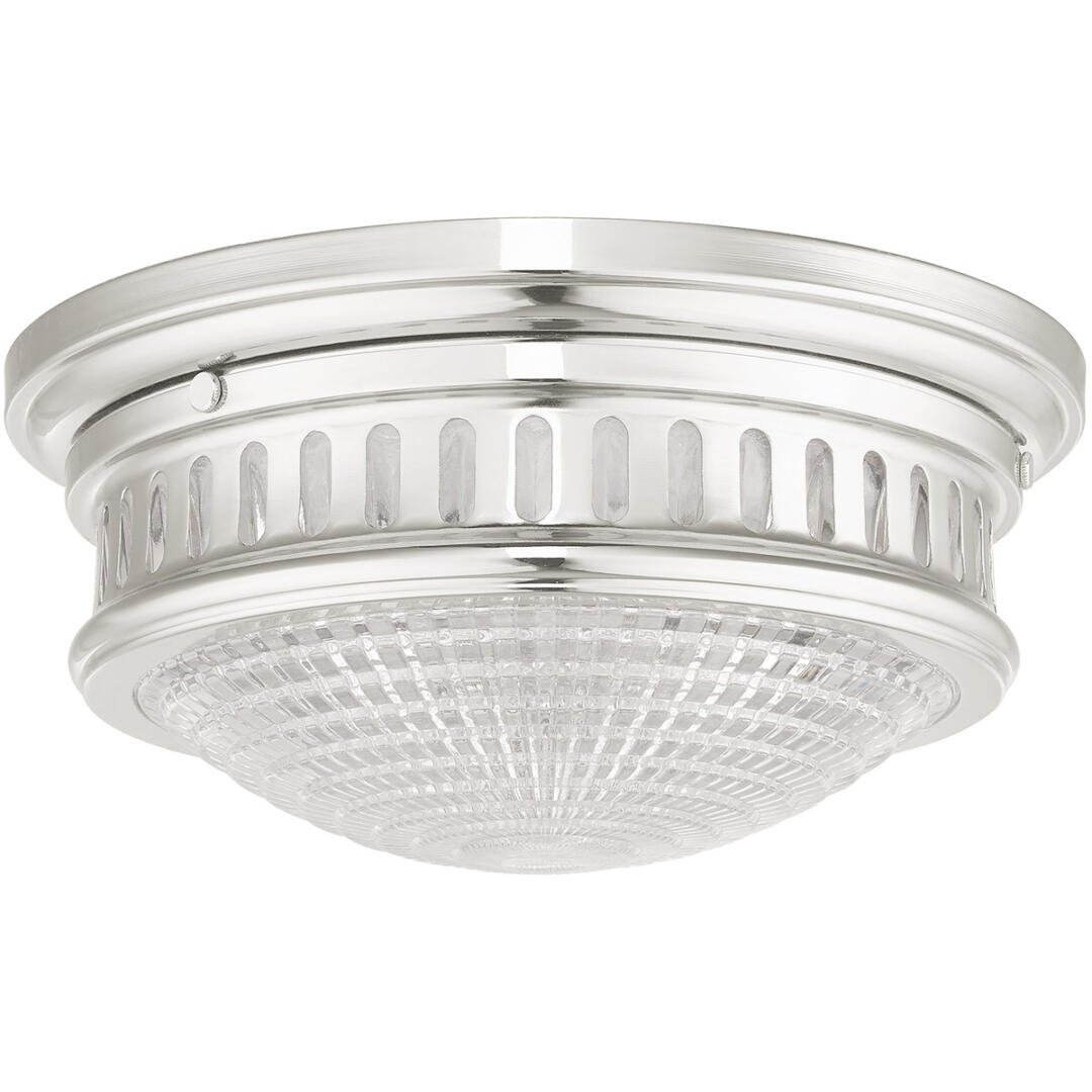 The classic simple design of this polished nickel flush mount makes it versatile to put any where. The clean lines give an updated look to the hand blown prismatic glass.