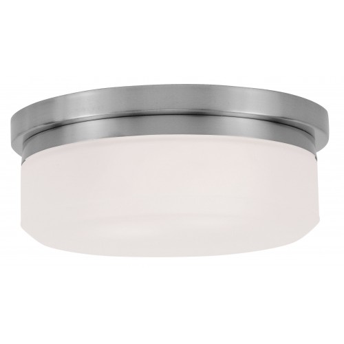 This flush mount from the Stratus collection offers bright lighting in a simple, unadorned style. Rounded hand blown satin opal white glass seems to float over a brushed nickel frame.