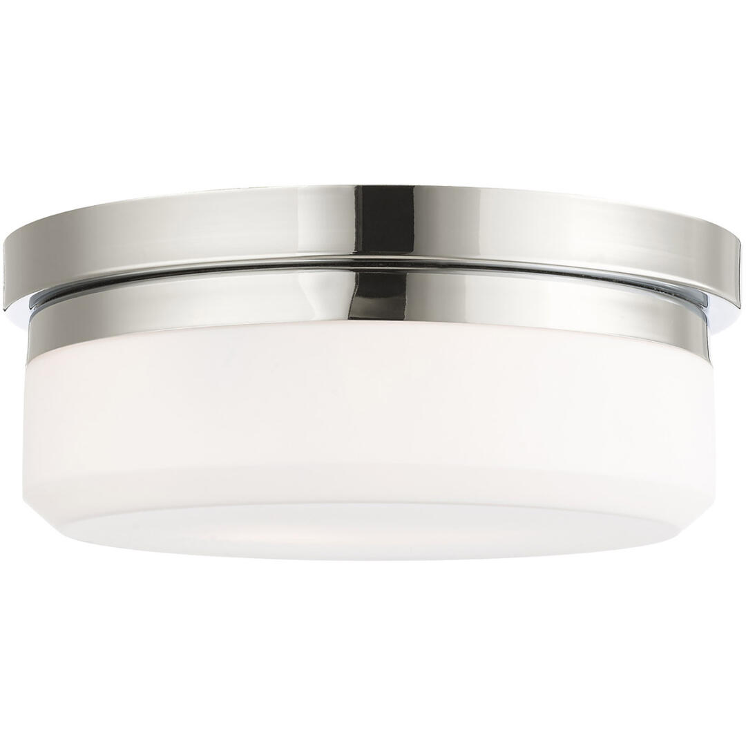 This flush mount from the Stratus collection offers bright lighting in a simple, unadorned style. Rounded hand blown satin opal white glass seems to float over a polished chrome frame.
