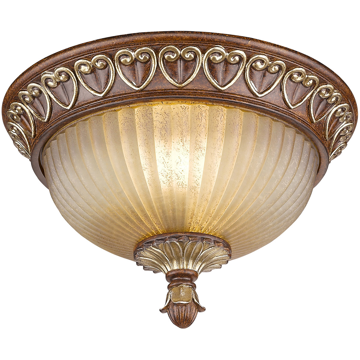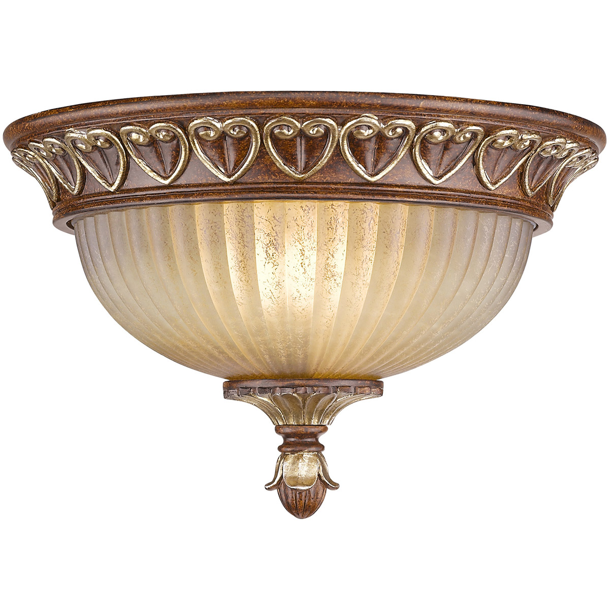 The Villa Verona collection of interior lighting features handsomely styled ironwork complete with scrolling details. This flush mount features a Verona bronze finish with aged gold leaf accents and rustic art glass. Display casual, traditional style with this beautiful fixture.