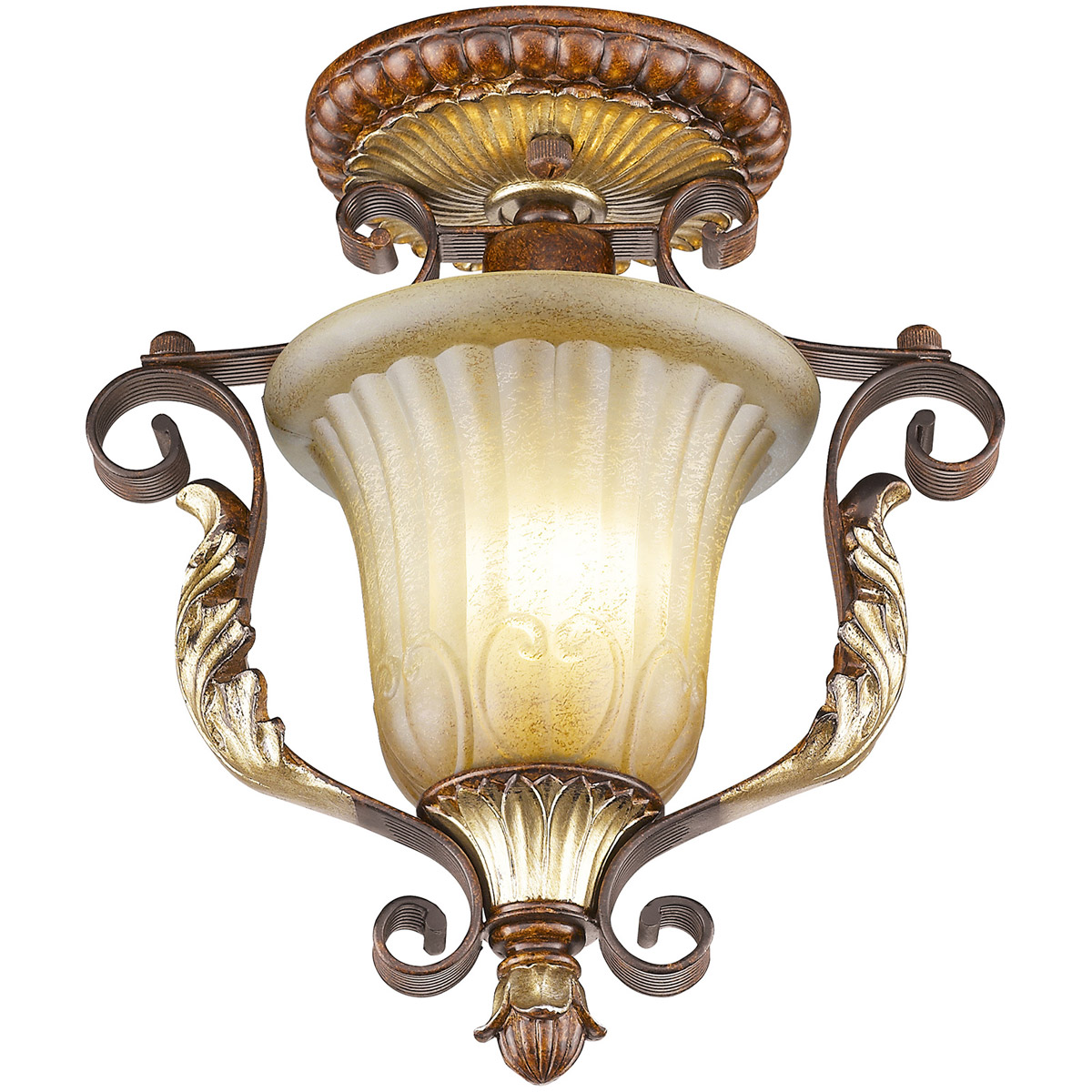 The Villa Verona collection of interior lighting features handsomely styled ironwork complete with scrolling details. This semi flush mount features a Verona bronze finish with aged gold leaf accents and rustic art glass. Display casual, traditional style with this beautiful fixture.