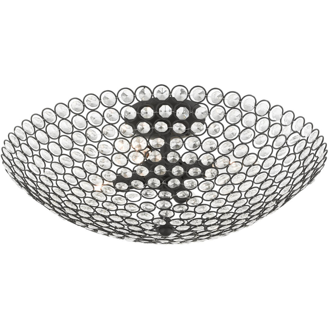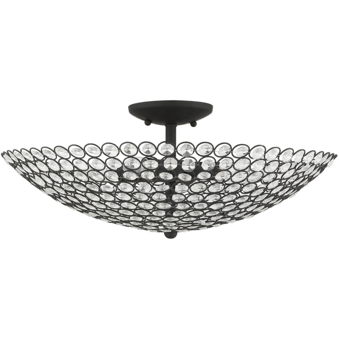 Cassandra features a dazzling array of K9 faceted crystal gems suspended within a modern frame. Light artfully reflects and refracts through these elements to provide a dramatic focal point to any room. This four-light extra-large semi flush mount will add an unmistakable touch of elegance to your dining room, bedroom, living room or entrance. It is shown in a black finish.