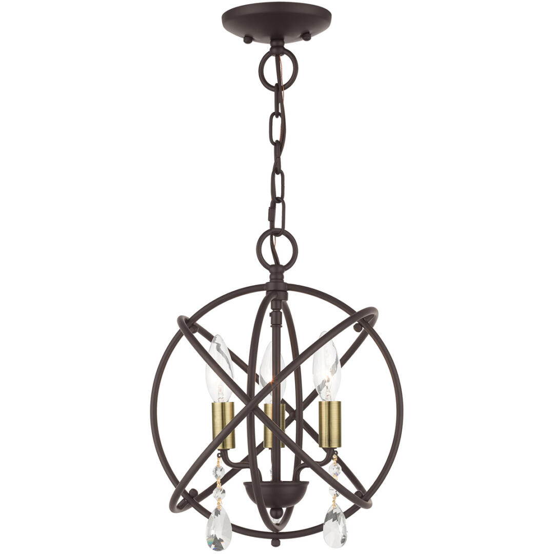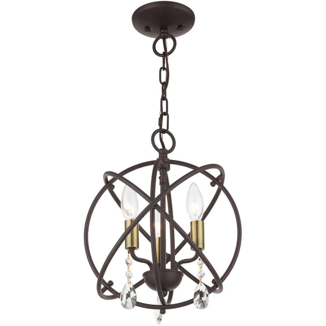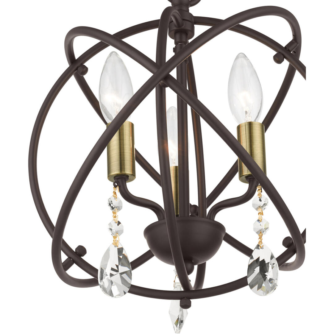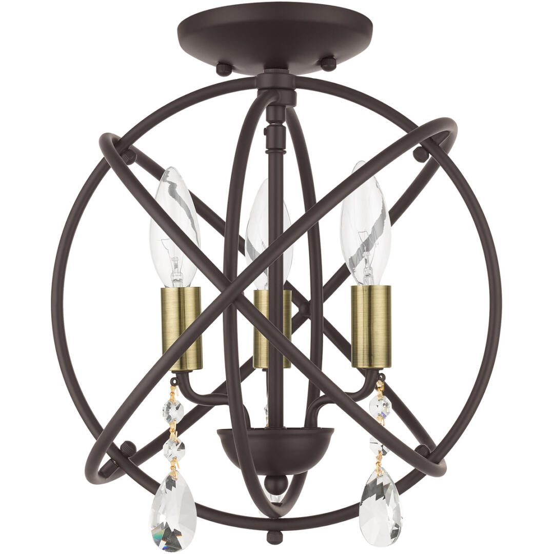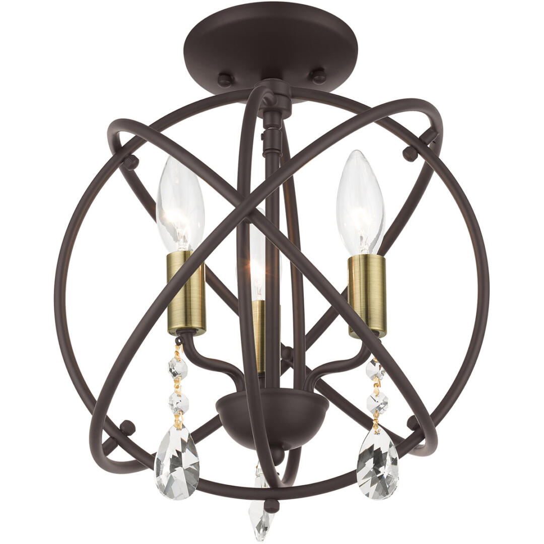 The delicate dangling crystals of the Aria collection adds an eclectic counterpoint to the luxurious orb. The three-arm light cluster nestled within orbiting rings of this petite light features faceted clear teardrop crystals. Use multiples of these fixtures over your kitchen island or convert this to a semi flush mount for your hallway or bathroom. With its easy installation and low upkeep requirements, this light will not disappoint. It is shown in a bronze finish with antique brass finish candles.