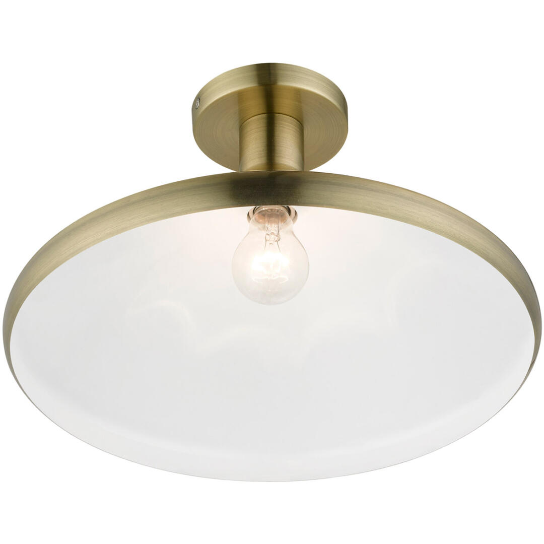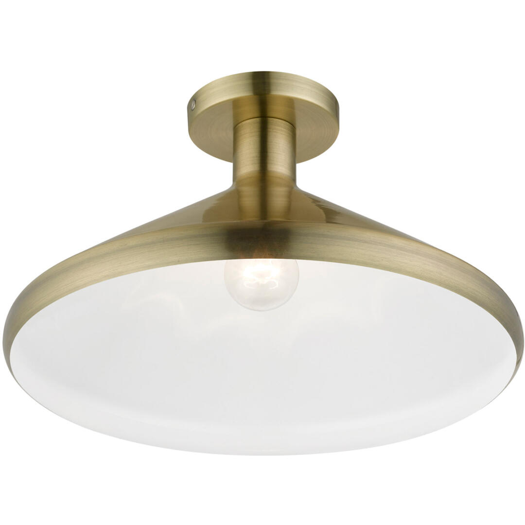 Featuring a clean and crisp modern look, the Geneva 1-light flush mount makes a contemporary statement with the smooth cone shape of its antique brass finish exterior. A gleaming shiny white finish on the interior of the metal shade brings a refined touch of style.