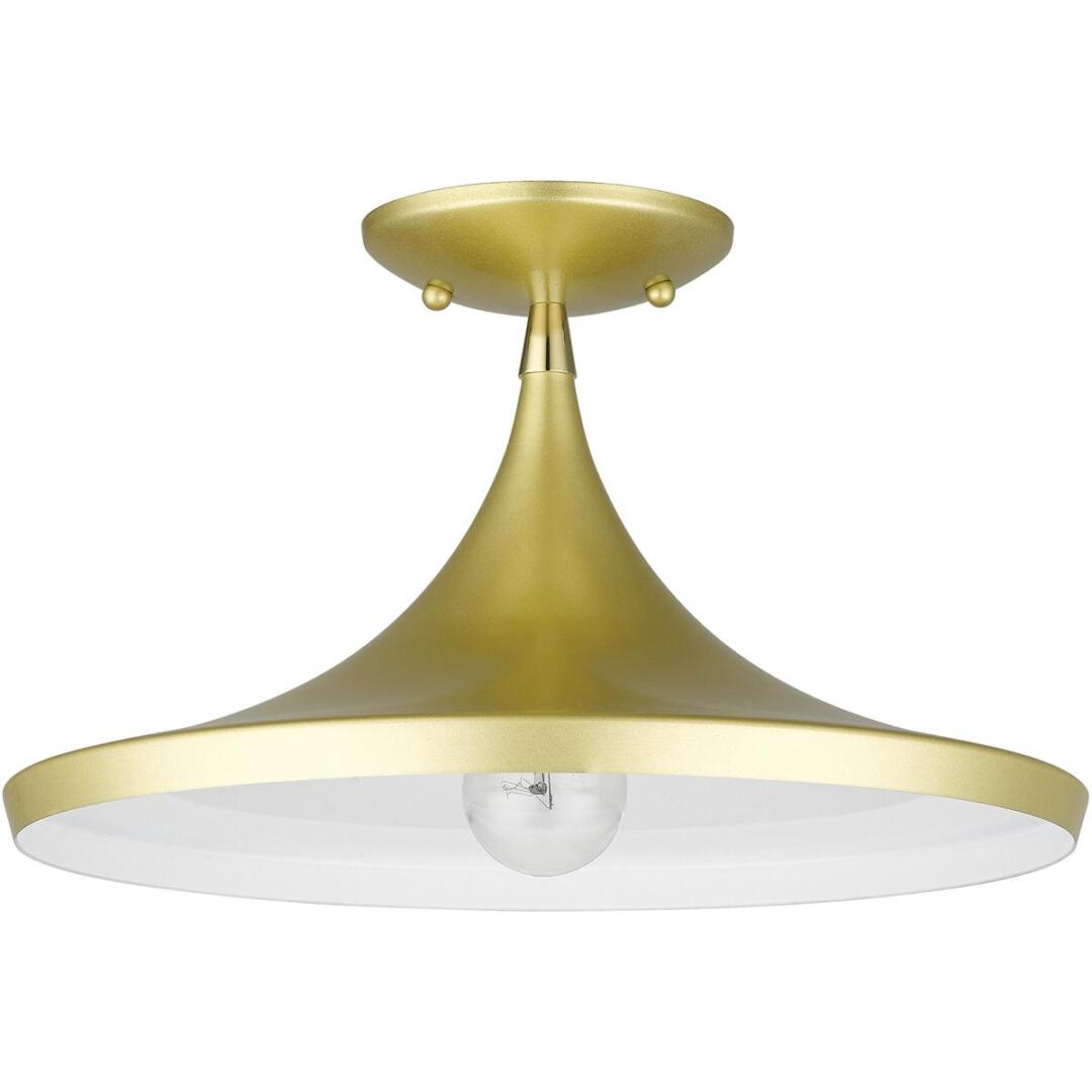 The distinctive shape of this soft gold semi-flush makes it a wonderful accent for a contemporary home. Inside the shade is a shiny white lining which gives the light a warm tone.
